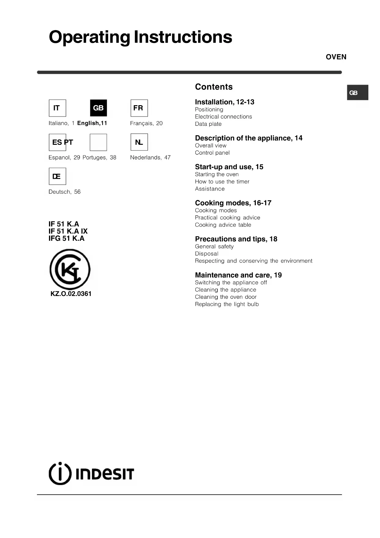 Installation, 12-13 PositioningElectrical connectionsData plate Description of the appliance, 14 Overall viewControl panel Start-up and use, 15 Starting the ovenHow to use the timerAssistance Cooking modes, 16-17 Cooking modesPractical cooking adviceCooking advice table Precautions and tips, 18 General safetyDisposalRespecting and conserving the environment Maintenance and care, 19 Switching the appliance offCleaning the applianceCleaning the oven doorReplacing the light bulb Operating Instructions