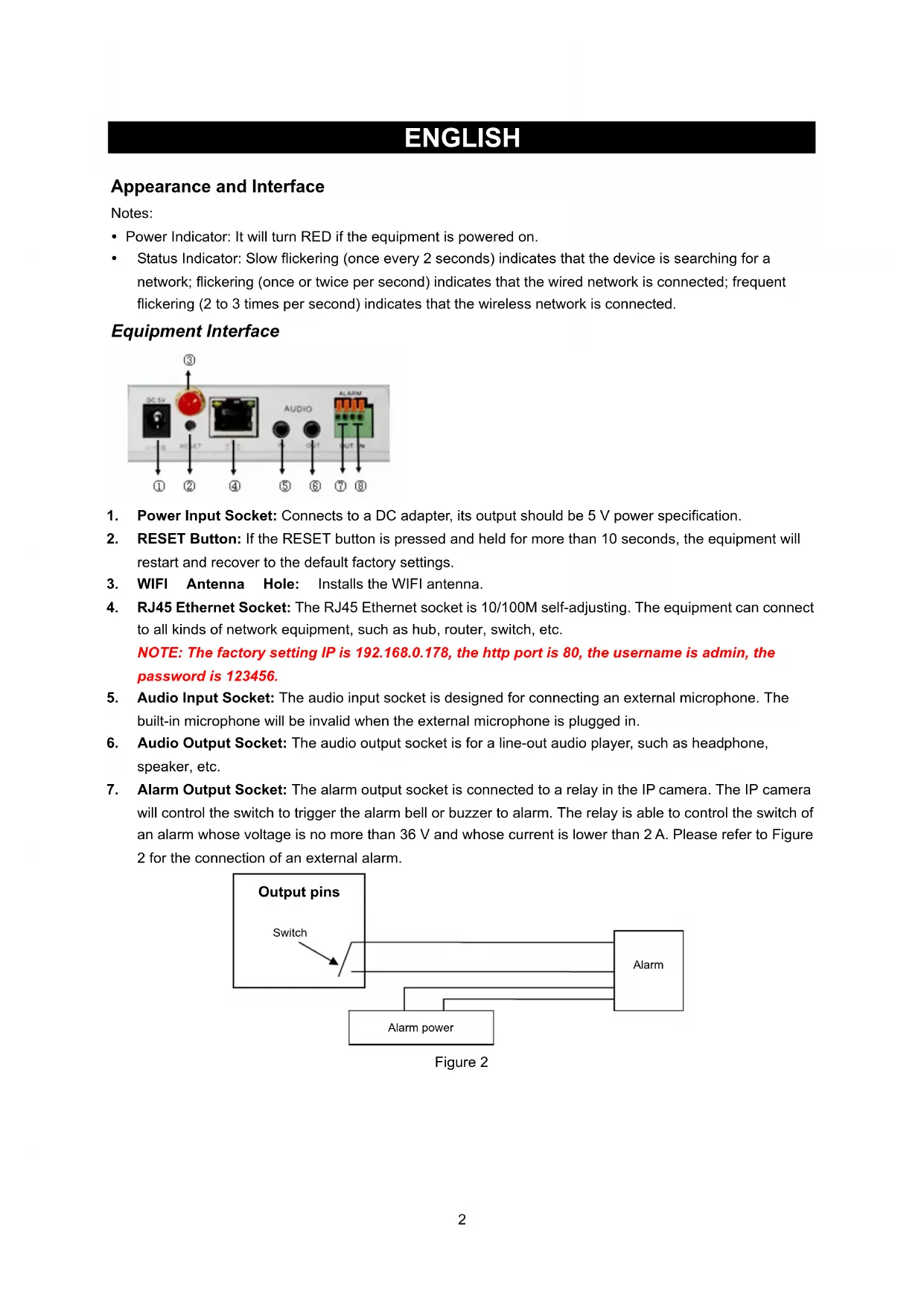 to all kinds of network equipment, such as hub, router, switch, etc. NOTE: The factory setting IP is 192.168.0.178, the http port is 80, the username is admin, the password is 123456.