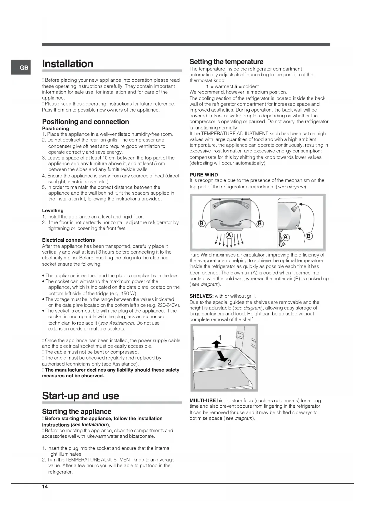 Pure Wind maximises air circulation, improving the efficiency ofthe evaporator and helping to achieve the optimal temperatureinside the refrigerator as quickly as possible each time it hasbeen opened. The blown air (A) is cooled when it comes intocontact with the cold wall, whereas the hotter air (B) is sucked up(see diagram).SHELVES: with or without grill.Due to the special guides the shelves are removable and the height is adjustable (see diagram), allowing easy storage of large containers and food. Height can be adjusted withoutcomplete removal of the shelf.MULTI-USE bin: to store food (such as cold meats) for a longtime and also prevent odours from lingering in the refrigerator.It can be removed for use and it may be shifted sideways tooptimise space (see diagram).GB