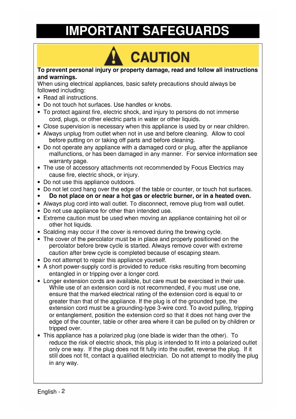 THIS WARRANTY IS IN LIEU OF ALL IMPLIED WARRANTYES, INCLUDING WARRANTYES OF MERCHANTABILITY, FITNESS FOR A PARTICULAR PURPOSE, PERFORMANCE, OR OTHERWISE, WHICH ARE HEREBY EXCUSED. IN NO EVENT SHALL FOCUS ELECTRICS BE LIABLE FOR ANY DAMAGES, WHETHER DIRECT, INDIRECT, INCIDENTAL, FORSEEABLE, CONSEQUENTIAL, OR SPECIAL, ARISING OUT OF OR IN CONNECTION WITH THIS APPLIANCE.