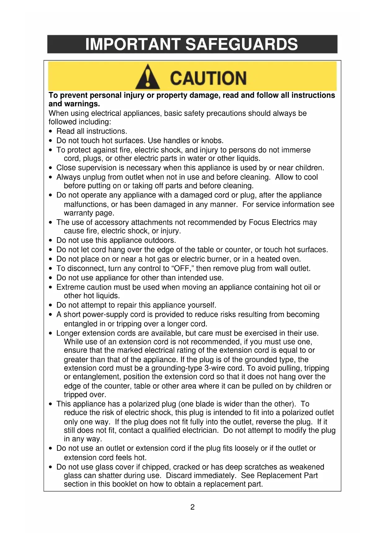 ARRANTY Appliance 1 Year Limited Warranty Focus Electrics, LLC (“Focus Electrics”) warrants this appliance from failures in the material and workmanship for one (1) year from the date of original purchase with proof of purchase, provided the appliance is operated and maintained in conformity with the provided Instruction Manual. Any failed part of the appliance will be repaired or replaced without charge at Focus Electrics’ discretion. This warranty applies to indoor household use only. This warranty does not cover any damage, including discoloration, to any non-stick surface of the appliance. This warranty is null and void, as determined solely by Focus Electrics if the appliance is damaged through accident, misuse, abuse, negligence, scratching, or if the appliance is altered in any way. THIS WARRANTY IS IN LIEU OF ALL IMPLIED WARRANTIES, INCLUDING WARRANTIES OF MERCHANTABILITY, FITNESS FOR A PARTICULAR PURPOSE, PERFORMANCE, OR OTHERWISE, WHICH ARE HEREBY EXCLUDED. IN NO EVENT SHALL FOCUS ELECTRICS BE LIABLE FOR ANY DAMAGES, WHETHER DIRECT, INDIRECT, INCIDENTAL, FORSEEABLE, CONSEQUENTIAL, OR SPECIAL, ARISING OUT OF OR IN CONNECTION WITH THIS APPLIANCE. If you think the appliance has failed or requires service within its warranty period, please contact the Focus Electrics Customer Service Department at (866) 290-1851, or e-mail us at service@focuselectrics.com. A receipt proving the original purchase date will be required for all warranty claims, hand written receipts are not accepted. You may also be required to return the appliance for inspection and evaluation. Return shipping costs are not refundable. Focus Electrics is not responsible for returns lost in transit. Valid only in USA and Canada