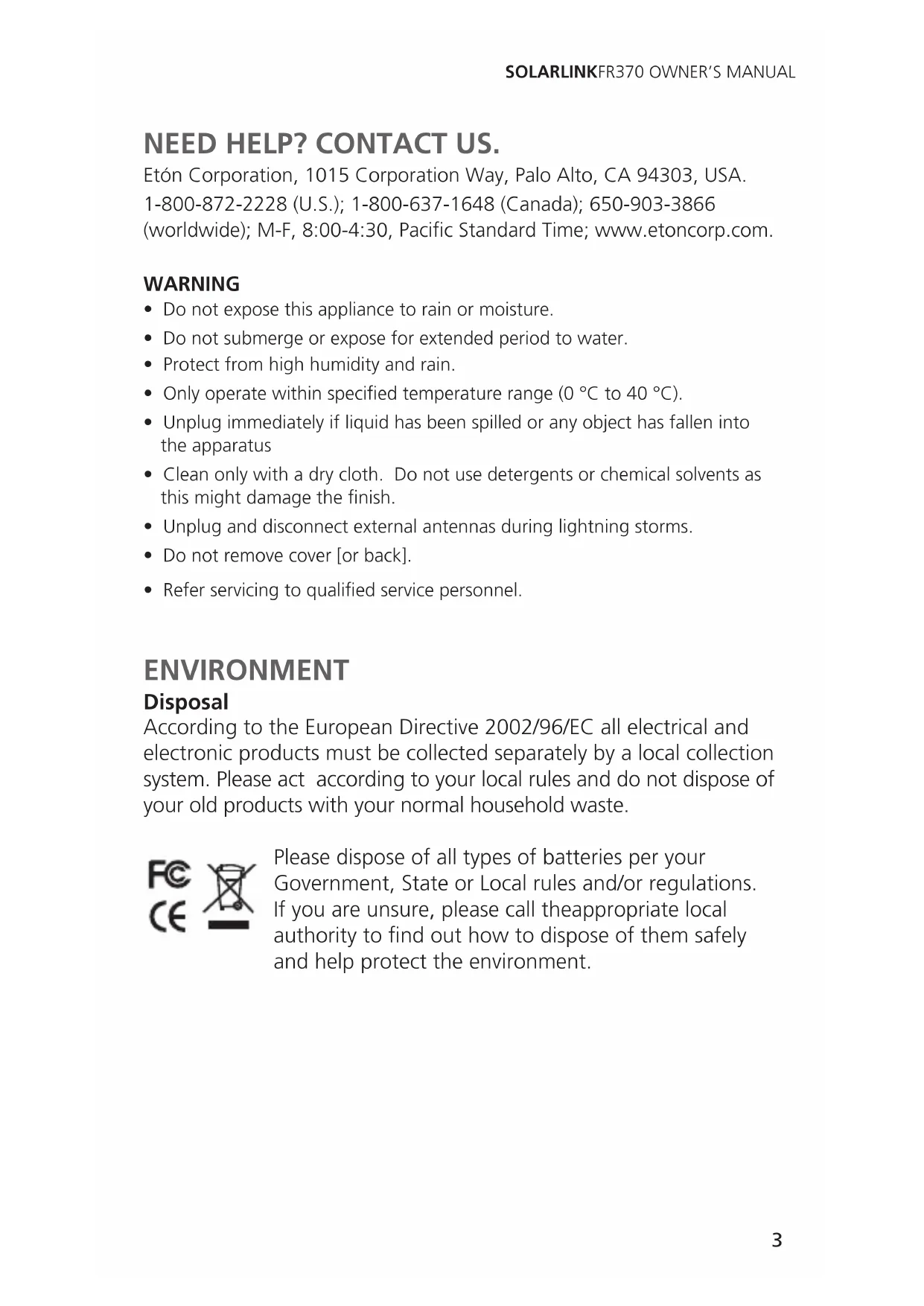 To obtain service for your product, we recommend first contacting an Etón service representative at 1-800-872-2228 US, 1-800-637-1648 Canada, (650) 903-3866 US, customersvc@etoncorp.com or your respective country distributor in Europe (see enclosed list) for problem determination and trouble-shooting. If further service is required, the technical staff will instruct how to proceed based on whether the radio is still under warranty or needs non-warranty service.