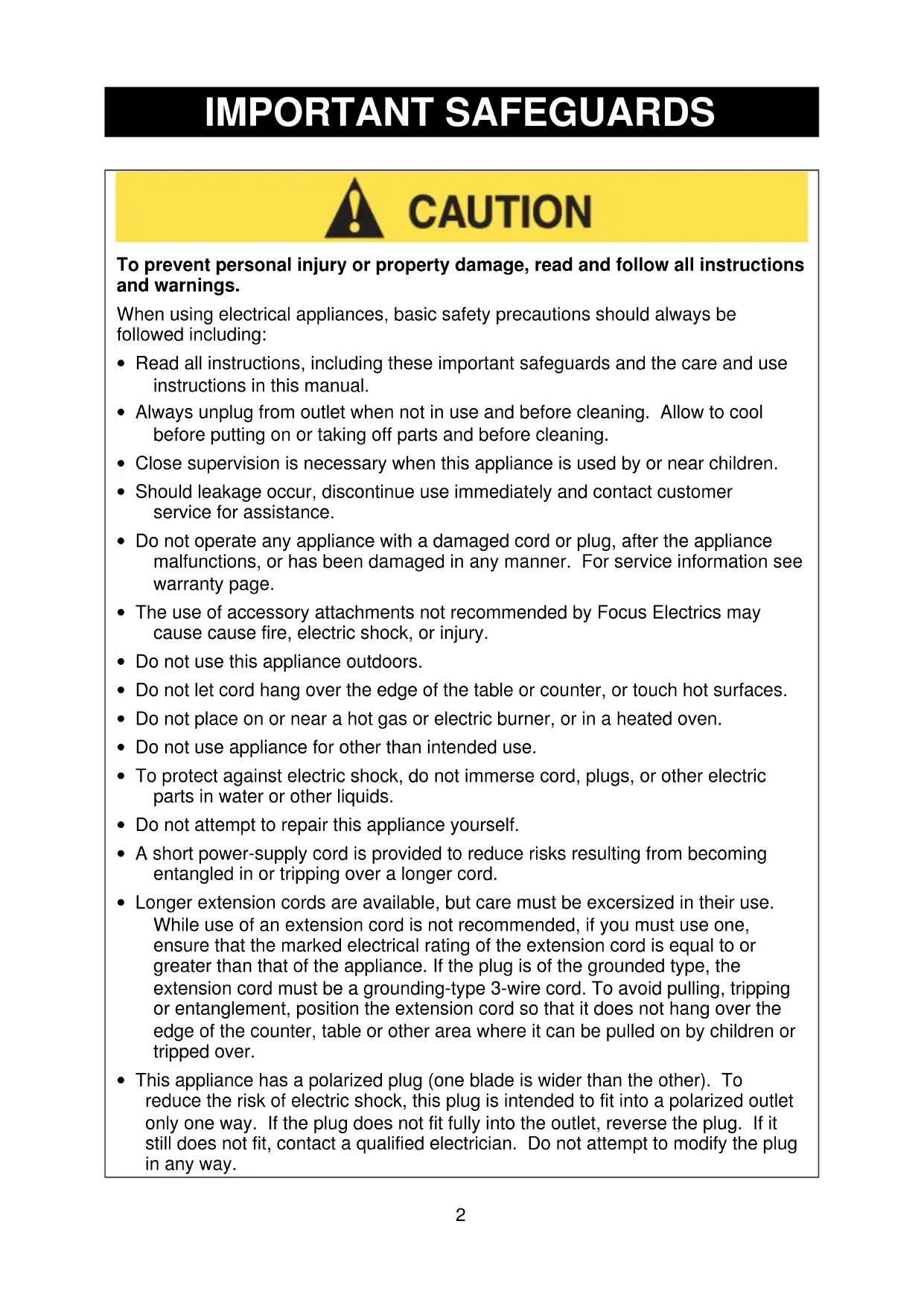 - The use of accessory attachments not recommended by Focus Electrics may cause cause fire, electric shock, or injury.