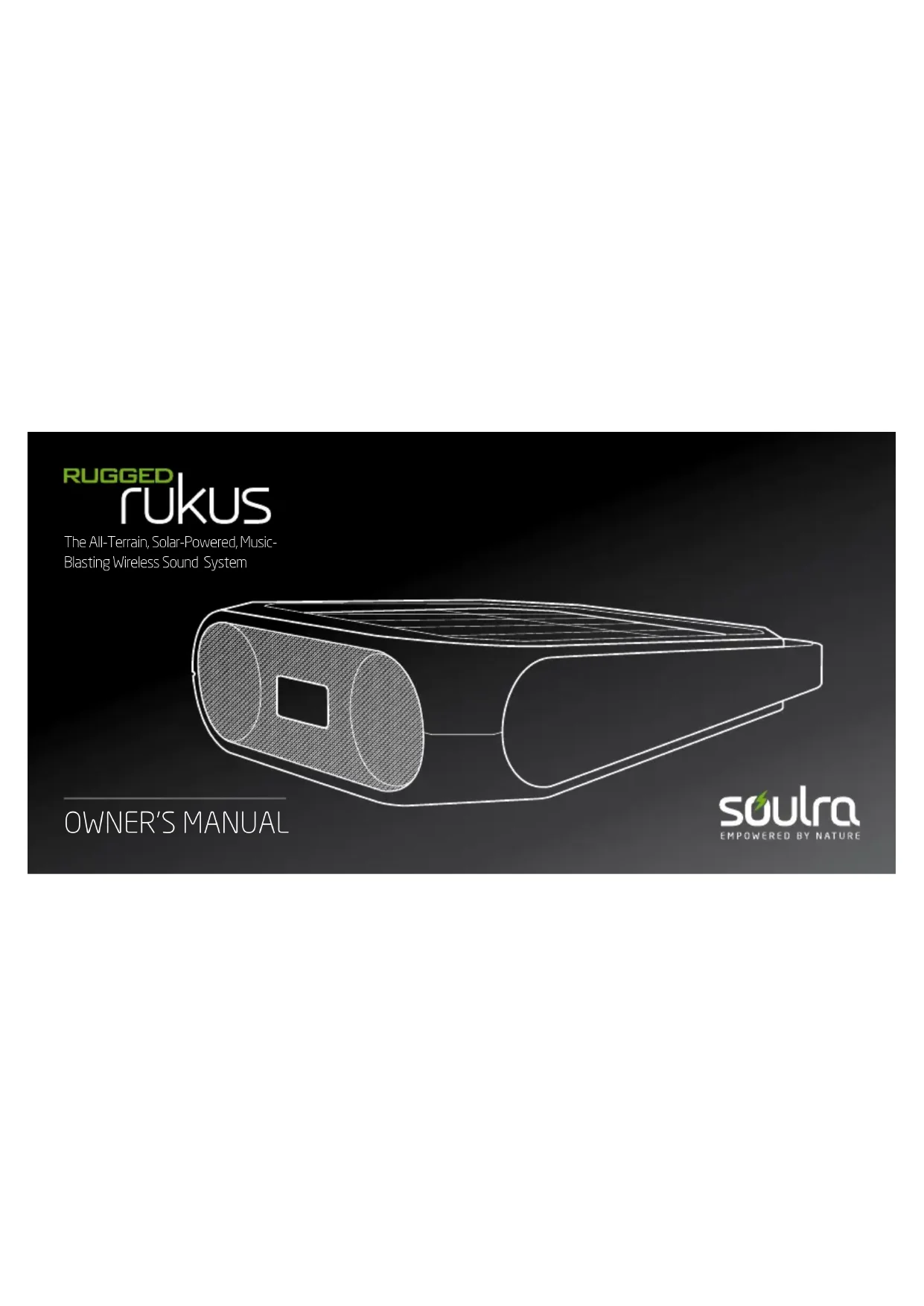 Thank you for purchasing the Soulra Rugged Rukus, a portable Bluetooth high-quality sound system featuring solar charging. The Rugged Rukus is powered from the rechargeable Li-ion battery charged by the solar panel or the AC adapter (USB cable included). Please read this user manual to get a good understanding of how the Rugged Rukus works and how to fully rock out with it!