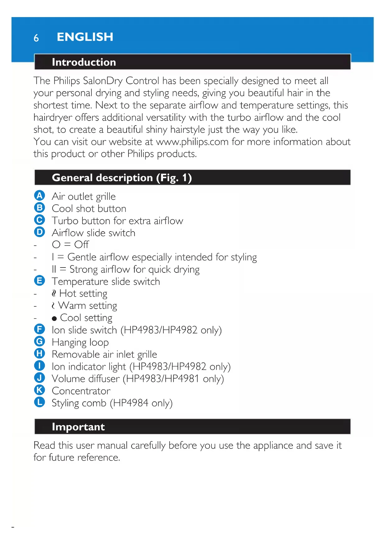 Download the instructions for your Hair dryer in PDF format for free! Find your manual SalonDry Control HP4983 - PHILIPS and take your electronic device back in hand. On this page are published all the documents necessary for the use of your device. SalonDry Control HP4983 by PHILIPS.