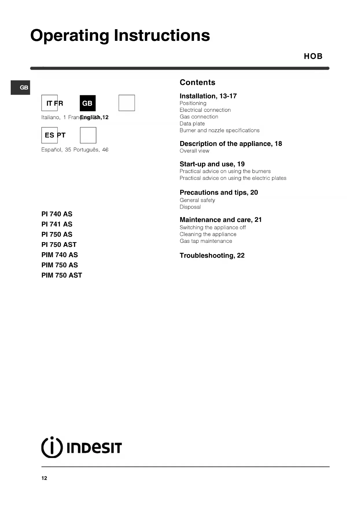 PIM 740 AS (IX) - Cooker INDESIT - Free user manual and instructions