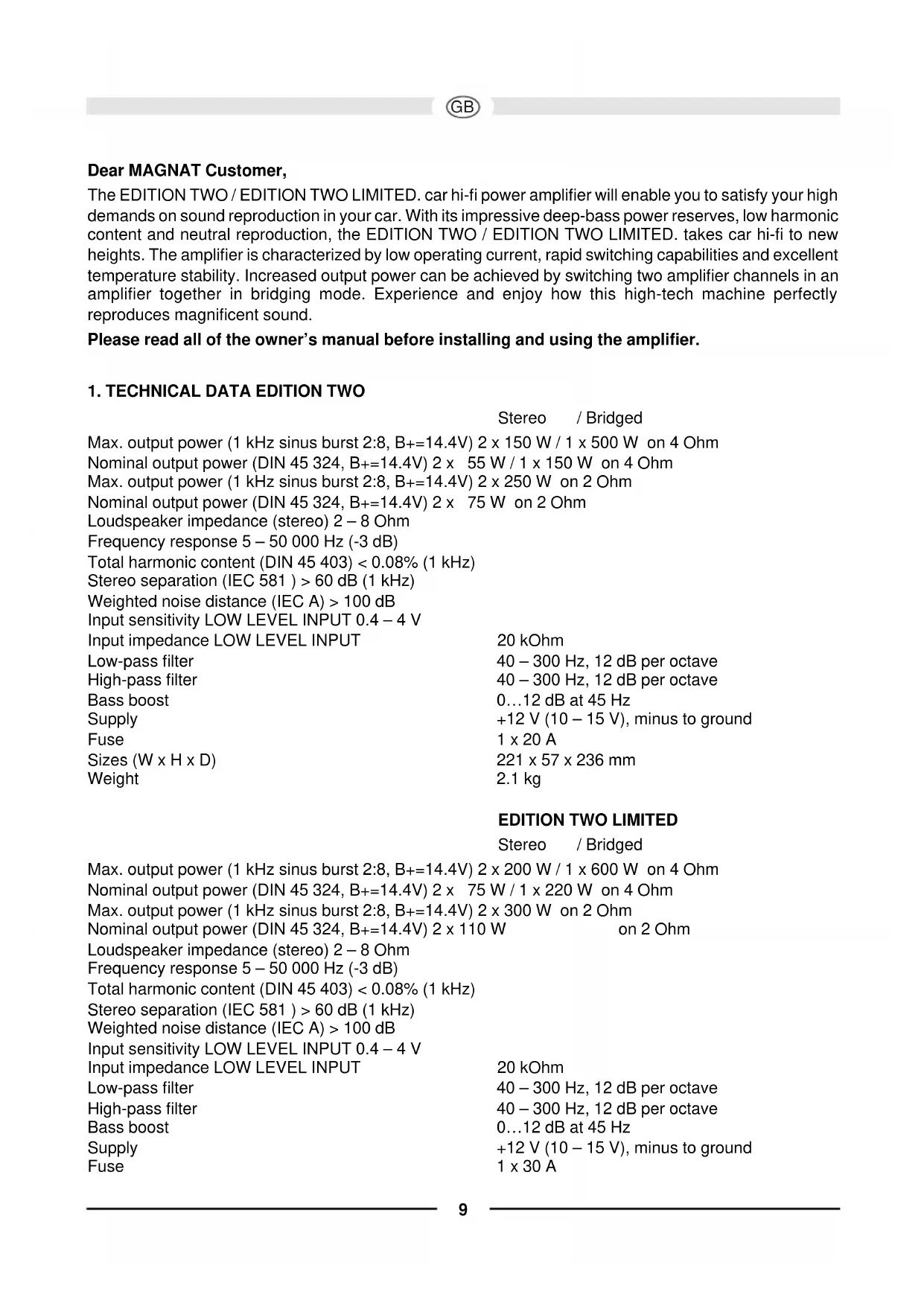 Dear MAGNAT Customer, The EDITION TWO / EDITION TWO LIMITED. car hi-fi power amplifier will enable you to satisfy your high demands on sound reproduction in your car. With its impressive deep-bass power reserves, low harmonic content and neutral reproduction, the EDITION TWO / EDITION TWO LIMITED. takes car hi-fi to new heights. The amplifier is characterized by low operating current, rapid switching capabilities and excellent temperature stability. Increased output power can be achieved by switching two amplifier channels in an amplifier together in bridging mode. Experience and enjoy how this high-tech machine perfectly reproduces magnificent sound. Please read all of the owner’s manual before installing and using the amplifier.
