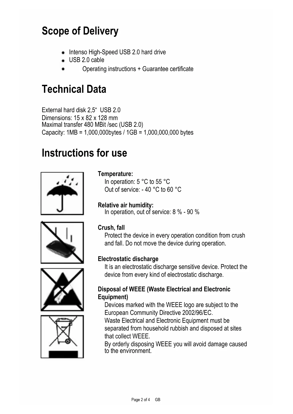 2,5“ MEMORYBOARDPage 2 of 4 GB Scope of Delivery Intenso High-Speed USB 2.0 hard drive USB 2.0 cable Operating instructions + Guarantee certificate Technical Data External hard disk 2,5“ USB 2.0 Dimensions: 15 x 82 x 128 mm Maximal transfer 480 MBit /sec (USB 2.0) Capacity: 1MB = 1,000,000bytes / 1GB = 1,000,000,000 bytes Instructions for use Temperature: In operation: 5 °C to 55 °C Out of service: - 40 °C to 60 °C Relative air humidity: In operation, out of service: 8 % - 90 % Crush, fall Protect the device in every operation condition from crush and fall. Do not move the device during operation. Electrostatic discharge It is an electrostatic discharge sensitive device. Protect the device from every kind of electrostatic discharge. Disposal of WEEE (Waste Electrical and Electronic Equipment) Devices marked with the WEEE logo are subject to the European Community Directive 2002/96/EC. Waste Electrical and Electronic Equipment must be separated from household rubbish and disposed at sites that collect WEEE. By orderly disposing WEEE you will avoid damage caused to the environment.Page 3 of 4 GB Installation Instructions System Requirements: This hard drive is compatible with the operating systems MS Windows XP/Vista/ Windows 7 and Mac OS 10.x. Please note: Your PC’s hardware configuration as well as the operating system employed can influence the compatibility of the hard drive. Hard Drive Connection: