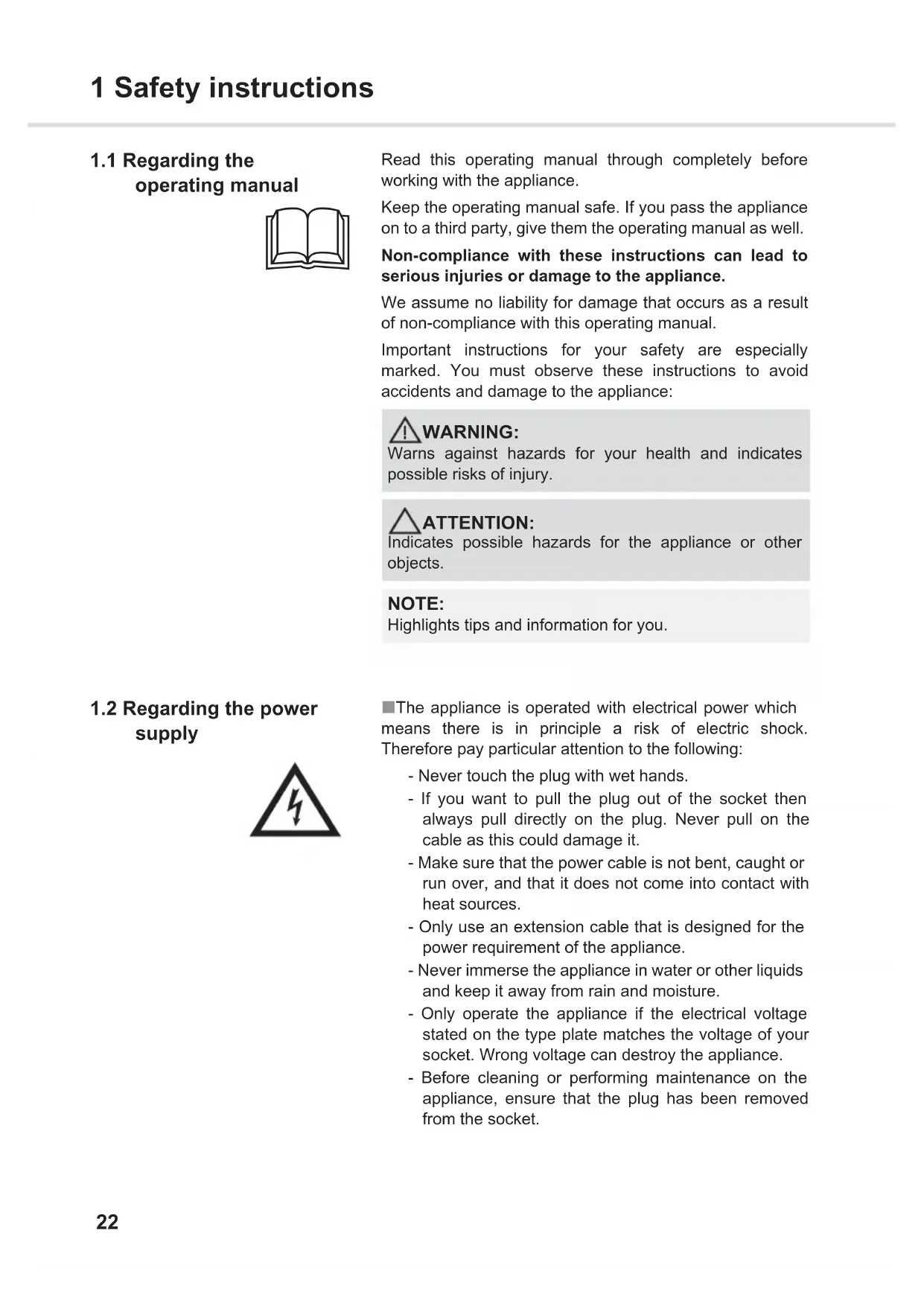 operating manual Read this operating manual through completely beforeworking with the appliance. Keep the operating manual safe. If you pass the applianceon to a third party, give them the operating manual as well. Non-compliance with these instructions can lead toserious injuries or damage to the appliance.We assume no liability for damage that occurs as a resultof non-compliance with this operating manual.Important instructions for your safety are especiallymarked. You must observe these instructions to avoidaccidents and damage to the appliance: 1.2 Regarding the power
