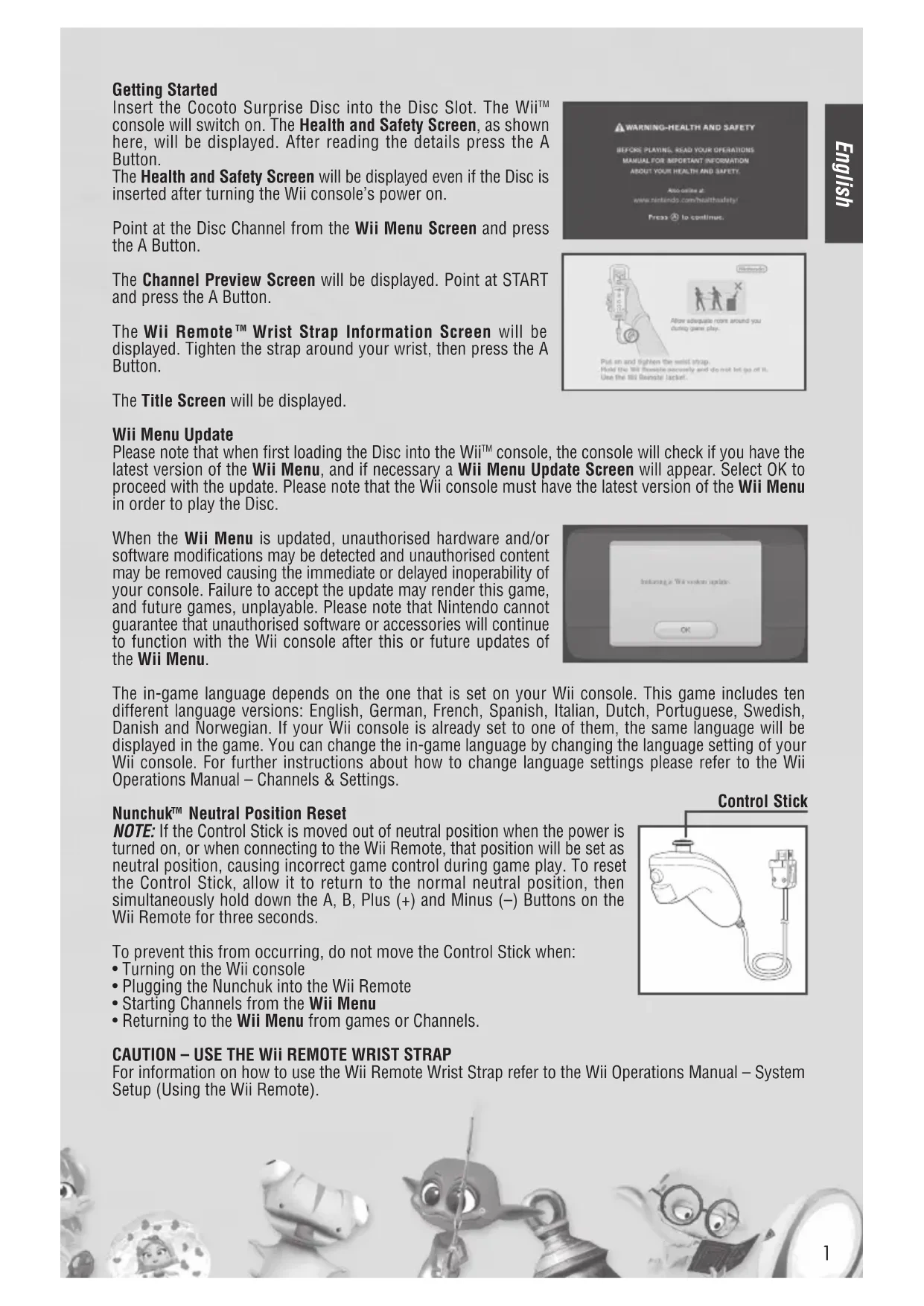 Insert the Cocoto Surprise Disc into the Disc Slot. The WiiTM console will switch on. The Health and Safety Screen, as shown here, will be displayed. After reading the details press the A Button.