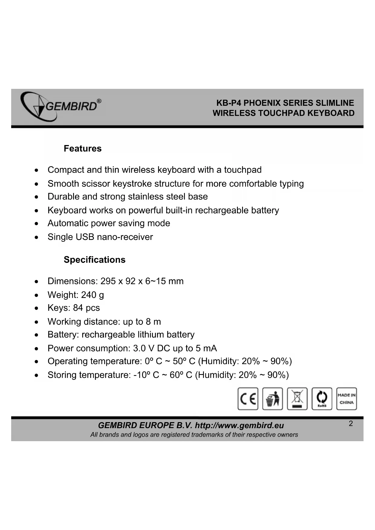 Features Compact and thin wireless keyboard with a touchpad Smooth scissor keystroke structure for more comfortable typing Durable and strong stainless steel base Keyboard works on powerful built-in rechargeable battery Automatic power saving mode Single USB nano-receiver Specifications Dimensions: 295 x 92 x 6~15 mm Weight: 240 g Keys: 84 pcs Working distance: up to 8 m Battery: rechargeable lithium battery Power consumption: 3.0 V DC up to 5 mA Operating temperature: 0º C ~ 50º C (Humidity: 20% ~ 90%) Storing temperature: -10º C ~ 60º C (Humidity: 20% ~ 90%)3 GEMBIRD EUROPE B.V. http://www.gembird.eu All brands and logos are registered trademarks of their respective owners
