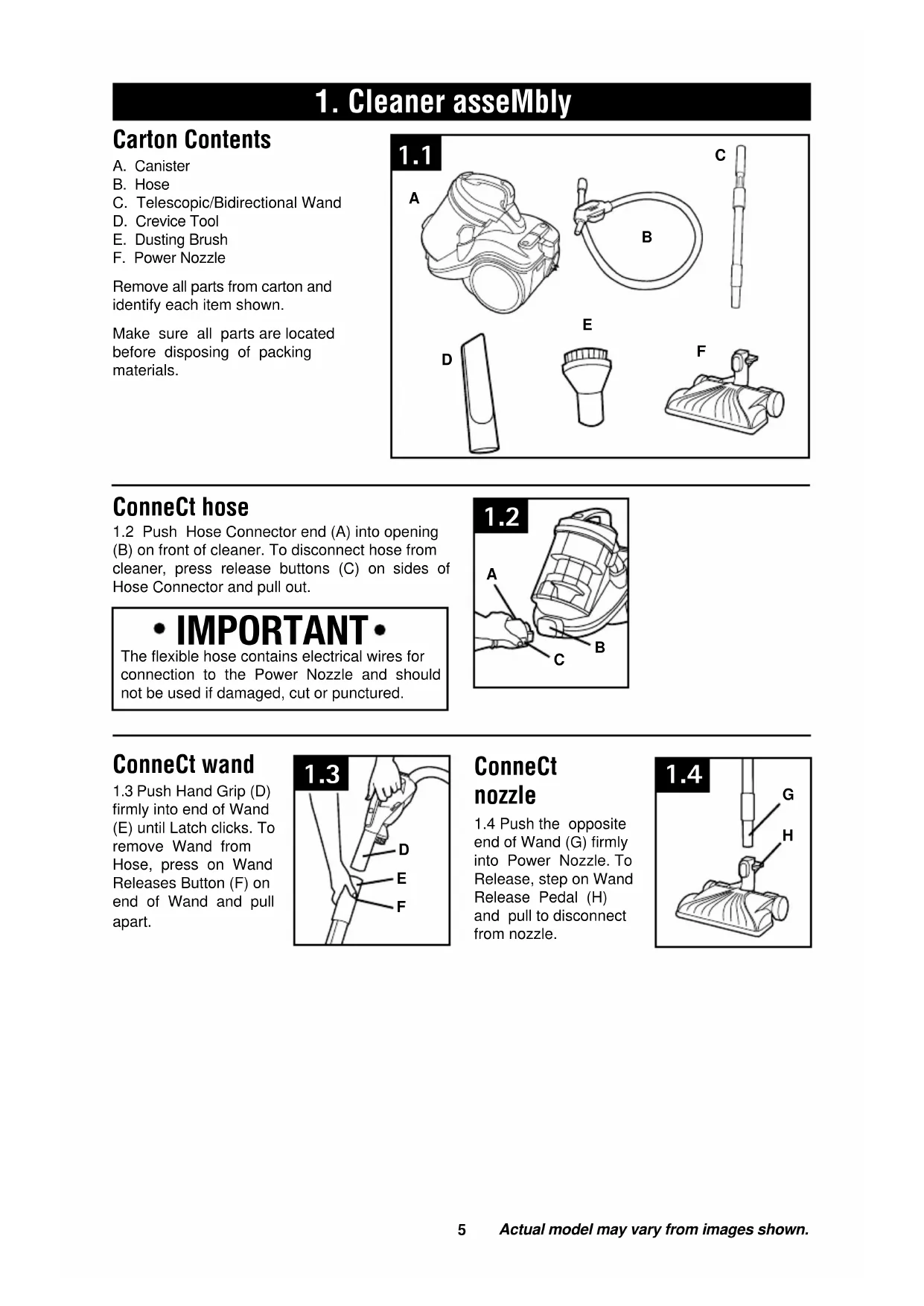 5 A. Canister B. HoseC. Telescopic/Bidirectional Wand D. Crevice Tool E. Dusting BrushF. Power NozzleRemove all parts from carton and identify each item shown. Make sure all parts are located before disposing of packing materials.1.2 Push Hose Connector end (A) into opening (B) on front of cleaner. To disconnect hose from cleaner, press release buttons (C) on sides of Hose Connector and pull out. ConneCt hose