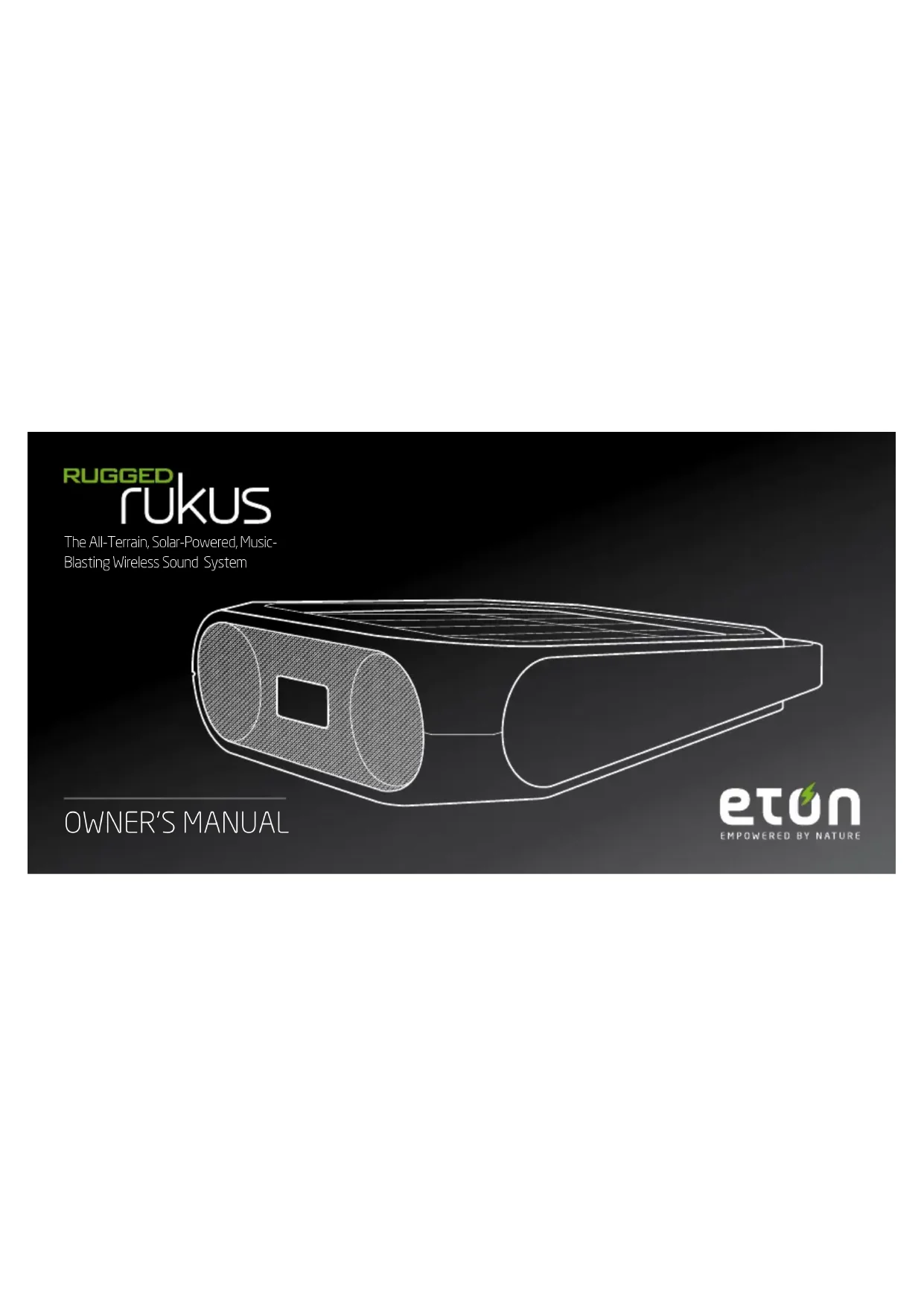 Thank you for purchasing the Etón Rugged Rukus, a portable Bluetooth high-quality sound system featuring solar charging. The Rugged Rukus is powered from the rechargeable Li-ion battery charged by the solar panel or the AC adapter (USB cable included). Please read this user manual to get a good understanding of how the Rugged Rukus works and how to fully rock out with it!