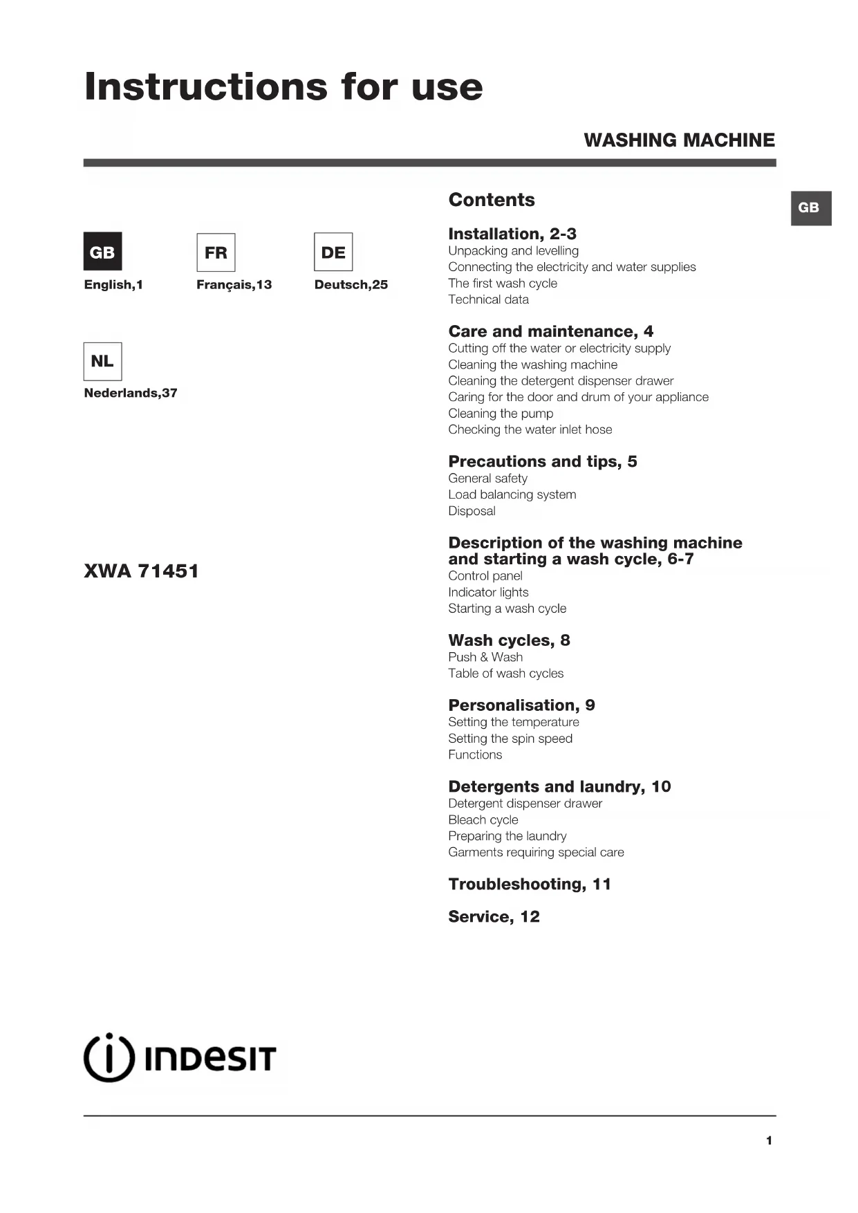 Download the instructions for your Machine à laver in PDF format for free! Find your manual XWA 71451 WB - INDESIT and take your electronic device back in hand. On this page are published all the documents necessary for the use of your device. XWA 71451 WB by INDESIT.
