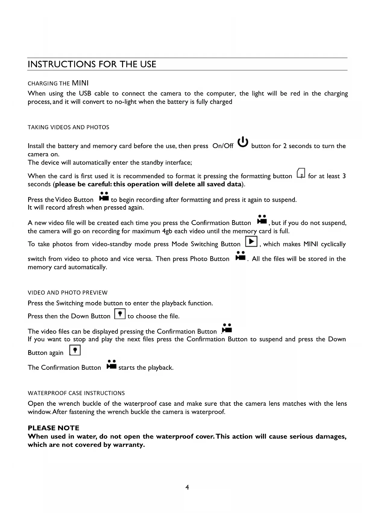 INSTRUCTIONS FOR THE USE CHARGING THE MINI When using the USB cable to connect the camera to the computer, the light will be red in the charging