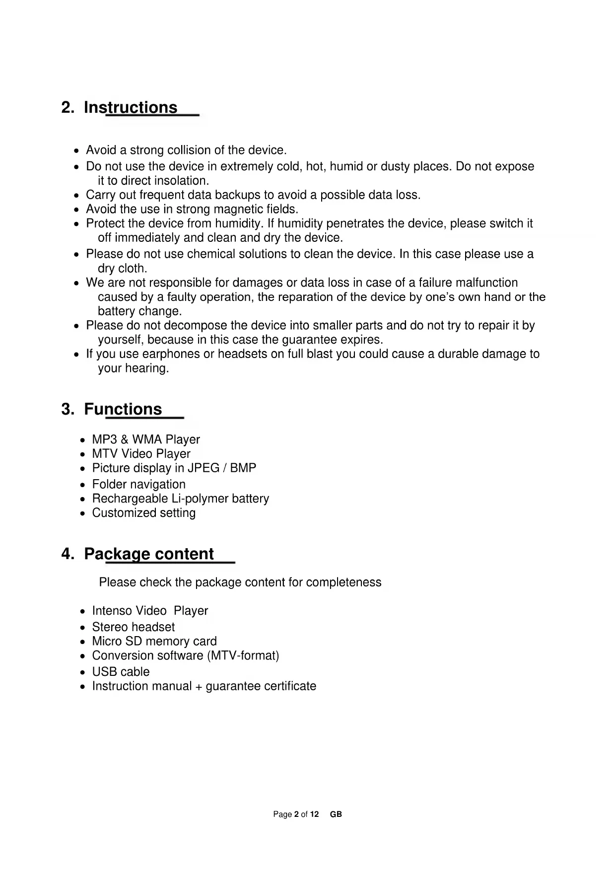 Photo format JPEG, BMP Bit rate MP3: 8-320kbps; WMA:5-320kbps SNR 80dB USB port USB 2.0 Operational between 0 Celsius ~ +45 Celsius Operational at a relative air moisture of < 80% Fit for storage at a relative air moisture of < 90%Page 12 of 12 GB