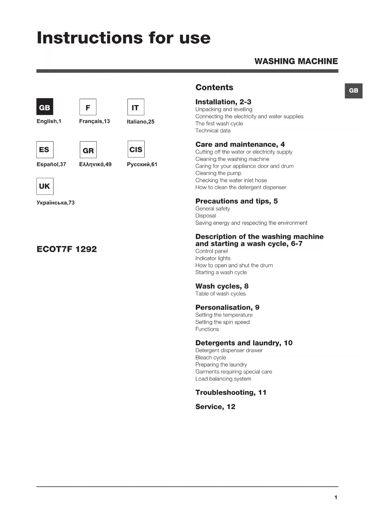 Contents Installation, 2-3 Unpacking and levelling Connecting the electricity and water supplies The first wash cycle Technical data Care and maintenance, 4 Cutting off the water or electricity supply Cleaning the washing machine Caring for your appliance door and drum Cleaning the pump Checking the water inlet hose How to clean the detergent dispenser Precautions and tips, 5 General safety Disposal Saving energy and respecting the environment Description of the washing machine and starting a wash cycle, 6-7 Control panel Indicator lights How to open and shut the drum Starting a wash cycle Wash cycles, 8 Table of wash cycles Personalisation, 9 Setting the temperature Setting the spin speed Functions Detergents and laundry, 10 Detergent dispenser drawer Bleach cycle Preparing the laundry Garments requiring special care Load balancing system Troubleshooting, 11 Service, 12 ECOT7F 1292 Instructions for use WASHING MACHINE English,1