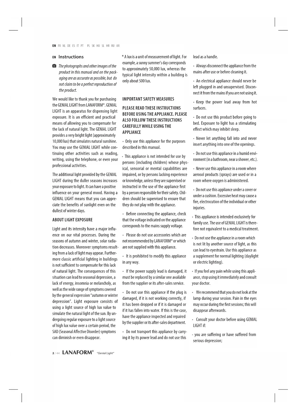 Download the instructions for your Light therapy in PDF format for free! Find your manual Genial Light - LANAFORM and take your electronic device back in hand. On this page are published all the documents necessary for the use of your device. Genial Light by LANAFORM.