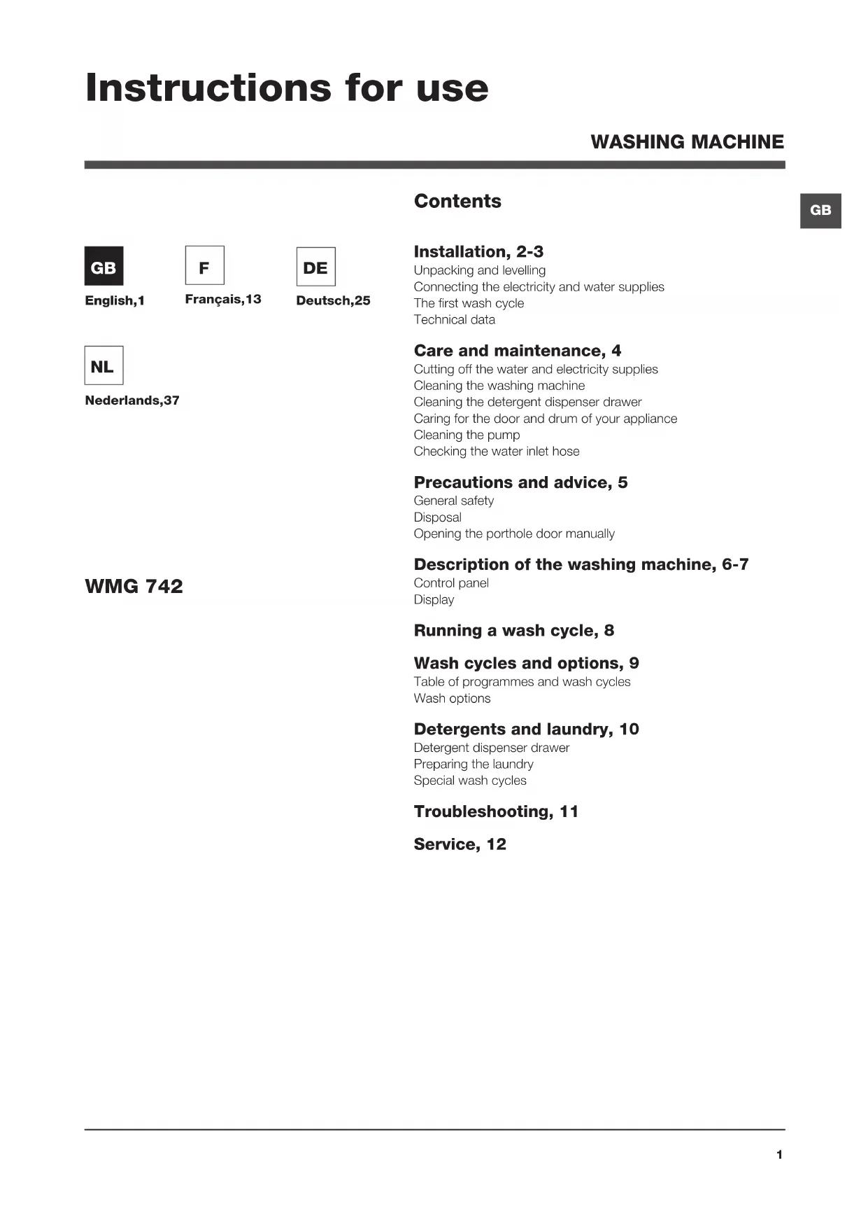 WASHING MACHINE Instructions for use Contents Installation, 2-3 Unpacking and levelling Connecting the electricity and water supplies The first wash cycle Technical data Care and maintenance, 4 Cutting off the water and electricity supplies Cleaning the washing machine Cleaning the detergent dispenser drawer Caring for the door and drum of your appliance Cleaning the pump Checking the water inlet hose Precautions and advice, 5 General safety Disposal Opening the porthole door manually Description of the washing machine, 6-7 Control panel Display Running a wash cycle, 8 Wash cycles and options, 9 Table of programmes and wash cycles Wash options Detergents and laundry, 10 Detergent dispenser drawer Preparing the laundry Special wash cycles Troubleshooting, 11 Service, 12 English,1