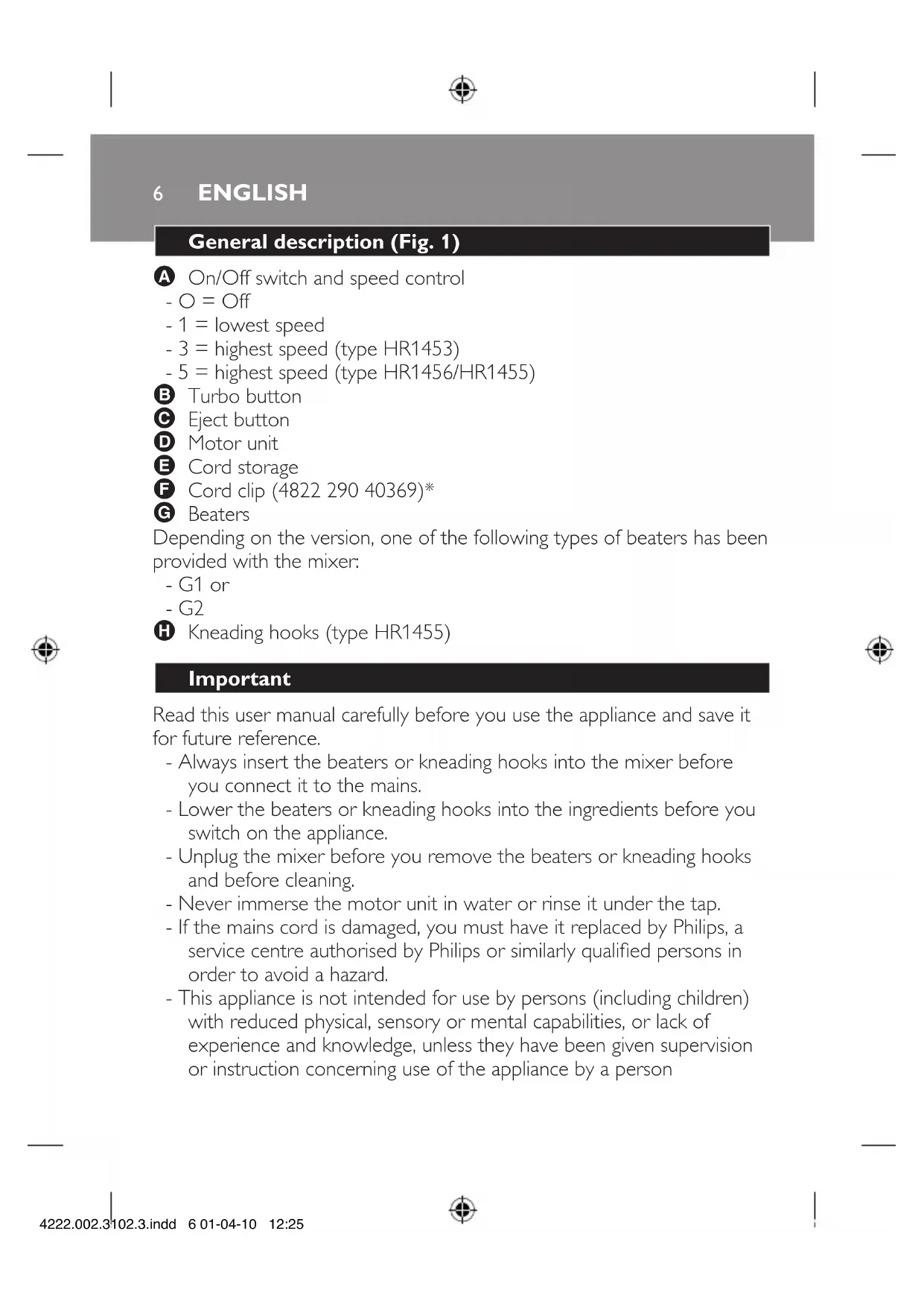 A On/Off switch and speed control - O = Off - 1 = lowest speed - 3 = highest speed (type HR1453) - 5 = highest speed (type HR1456/HR1455) B Turbo button C Eject button D Motor unit E Cord storage F Cord clip (4822 290 40369)* G Beaters Depending on the version, one of the following types of beaters has been provided with the mixer: - G1 or - G2 H Kneading hooks (type HR1455)