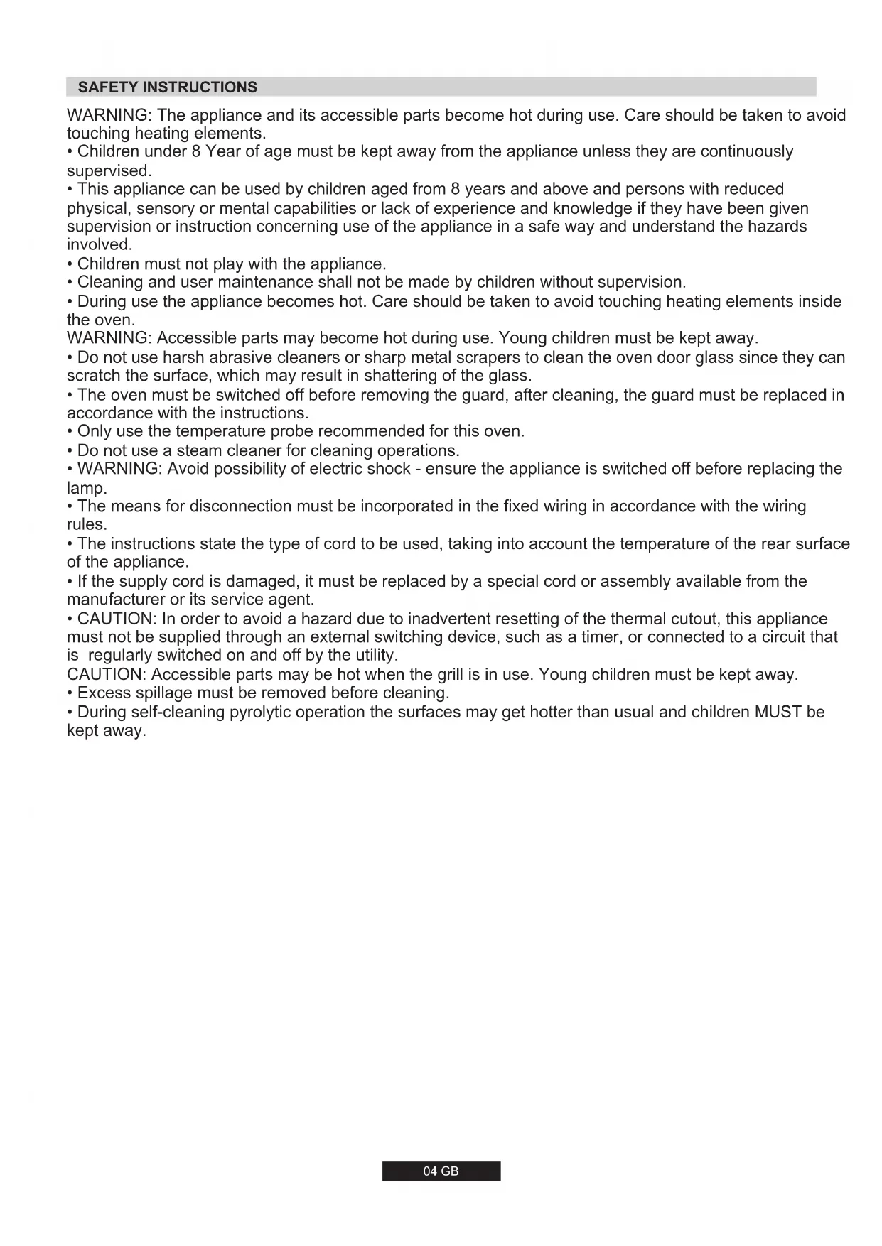 • During self-cleaning pyrolytic operation the surfaces may get hotter than usual and children MUST be