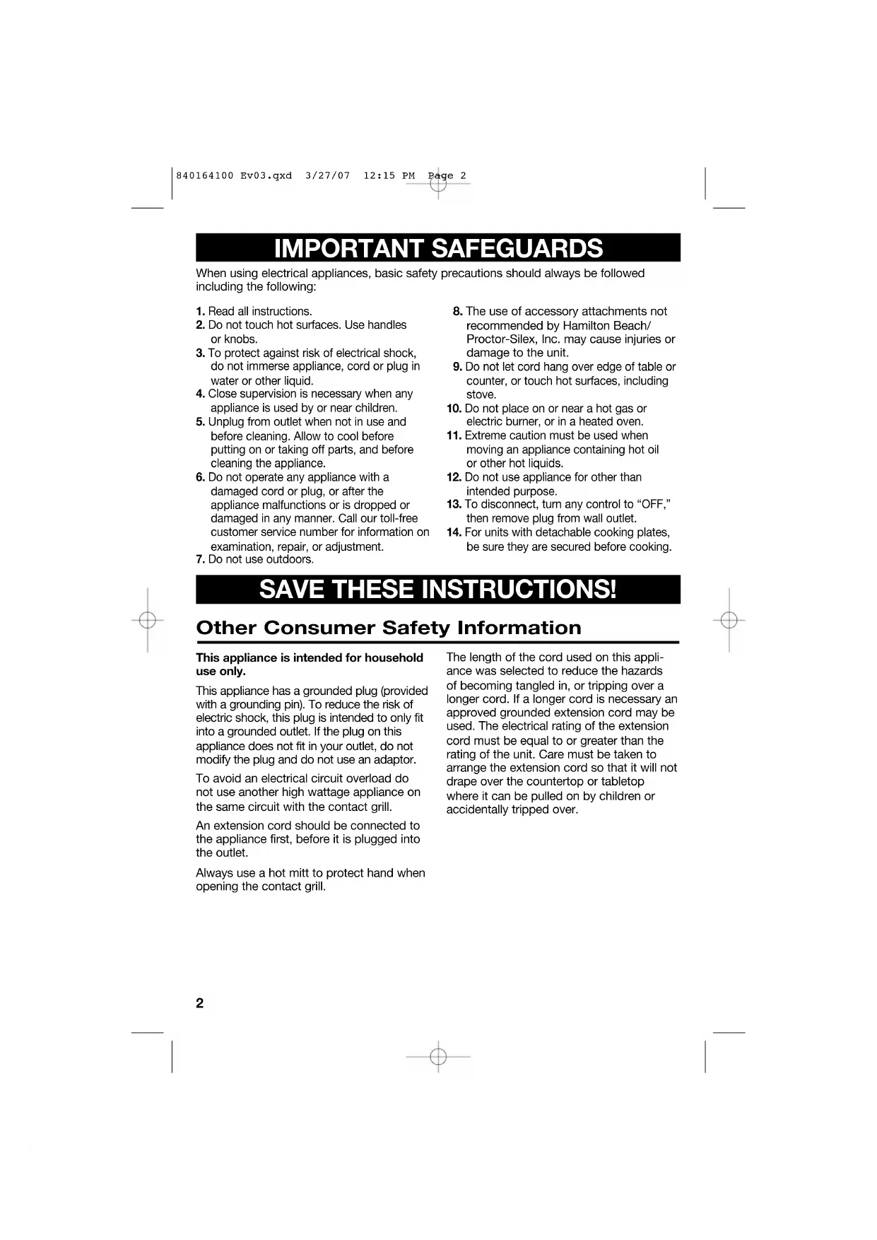 IMPORTANT SAFEGUARDS SAVE THESE INSTRUCTIONS!