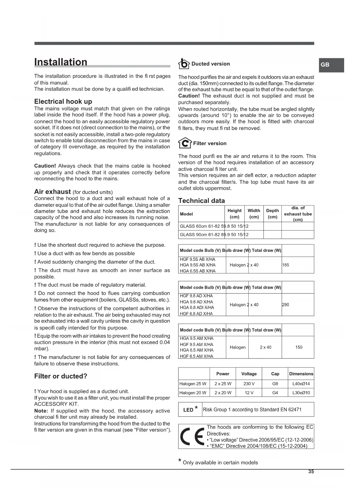 Installation The installation procedure is illustrated in the fi rst pages of this manual. The installation must be done by a qualifi ed technician. Electrical hook up The mains voltage must match that given on the ratings label inside the hood itself. If the hood has a power plug, connect the hood to an easily accessible regulatory power socket. If it does not (direct connection to the mains), or the socket is not easily accessible, install a two-pole regulatory switch to enable total disconnection from the mains in case of category III overvoltage, as required by the installation regulations. Caution! Always check that the mains cable is hooked up properly and check that it operates correctly before reconnecting the hood to the mains. Air exhaust (for ducted units) Connect the hood to a duct and wall exhaust hole of a diameter equal to that of the air outlet fl ange. Using a smaller diameter tube and exhaust hole reduces the extraction capacity of the hood and also increases its running noise. The manufacturer is not liable for any consequences of doing so. ! Use the shortest duct required to achieve the purpose. ! Use a duct with as few bends as possible ! Avoid suddenly changing the diameter of the duct. ! The duct must have as smooth an inner surface as possible. ! The duct must be made of regulatory material. ! Do not connect the hood to fl ues carrying combustion fumes from other equipment (boilers, GLASSs, stoves, etc.). ! Observe the instructions of the competent authorities in relation to the air exhaust. The air being exhausted may not be exhausted into a wall cavity unless the cavity in question is specifi cally intended for this purpose. ! Equip the room with air intakes to prevent the hood creating suction pressure in the interior (this must not exceed 0.04 mbar). ! The manufacturer is not liable for any consequences of failure to observe these instructions. Filter or ducted? ! Your hood is supplied as a ducted unit. If you wish to use it as a fi lter unit, you must install the proper ACCESSORY KIT. Note: If supplied with the hood, the accessory active charcoal fi lter unit may already be installed. Instructions for transforming the hood from the ducted to the fi lter version are given in this manual (see “Filter version”). Ducted version The hood purifi es the air and expels it outdoors via an exhaust duct (dia. 150mm) connected to its outlet fl ange. The diameter of the exhaust tube must be equal to that of the outlet fl ange. Caution! The exhaust duct is not supplied and must be purchased separately. When routed horizontally, the tube must be angled slightly upwards (around 10°) to enable the air to be conveyed outdoors more easily. If the hood is fi tted with charcoal fi lters, they must fi rst be removed. Filter version The hood purifi es the air and returns it to the room. This version of the hood requires installation of an accessory active charcoal fi lter unit. This version requires an air defl ector, a reduction adapter and the charcoal fi lter/s. The top tube must have its air outlet slots uppermost. Technical data ModelHeight (cm) Width (cm) Depth (cm) dia. of exhaust tube (cm) GLASS 60cm 61-82 59.8 50 15/12GLASS 90cm 61-82 89.9 50 15/12Model code Bulb (V) Bulb draw (W) Total draw (W)HGF 9.5S AB X/HAHGA 9.5S AB X/HAHGA 6.5S AB X/HAHalogen 2 x 40 185Model code Bulb (V) Bulb draw (W) Total draw (W)HGF 9.8 AD X/HAHGA 9.8 AD X/HAHGA 6.8 ADI X/HAHGF 6.8 AD X/HAHalogen 2 x 40 290Model code Bulb (V) Bulb draw (W) Total draw (W)HGA 9.5 AM X/HAHGF 9.5 AM X/HAHGA 6.5 AM X/HAHGF 6.5 AM X/HAHalogen 2 x 40 150Power Voltage Cap Dimensions Halogen 25 W 2 x 25 W 230 V G9 L40xØ14 Halogen 20 W 2 x 20 W 12 V G4 L30xØ10 LED *Risk Group 1 according to Standard EN 62471 The hoods are conforming to the following EC Directives: