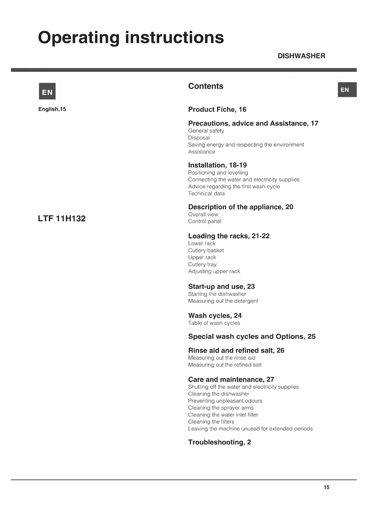 Operating instructions Contents Product Fiche, 16 Precautions, advice and Assistance, 17 General safety Disposal Saving energy and respecting the environment Assistance Installation, 18-19 Positioning and levelling Connecting the water and electricity supplies Advice regarding the first wash cycle Technical data Description of the appliance, 20 Overall view Control panel Loading the racks, 21-22 Lower rack Cutlery basket Upper rack Cutlery tray Adjusting upper rack Start-up and use, 23 Starting the dishwasher Measuring out the detergent Wash cycles, 24 Table of wash cycles Special wash cycles and Options, 25 Rinse aid and refined salt, 26 Measuring out the rinse aid Measuring out the refined salt Care and maintenance, 27 Shutting off the water and electricity supplies Cleaning the dishwasher Preventing unpleasant odours Cleaning the sprayer arms Cleaning the water inlet filter Cleaning the filters Leaving the machine unused for extended periods Troubleshooting, 2 English,15