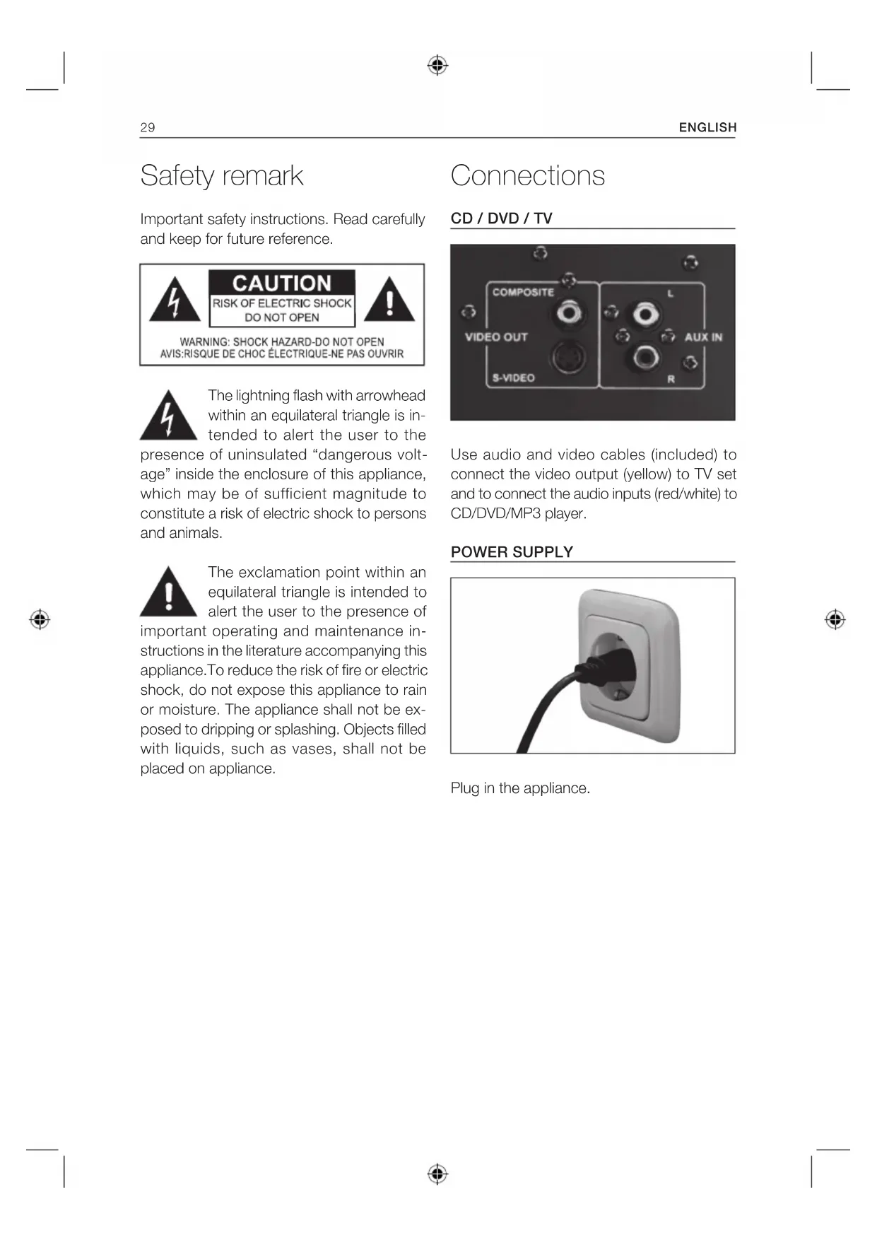 Use audio and video cables (included) to connect the video output (yellow) to TV set and to connect the audio inputs (red/white) to CD/DVD/MP3 player. POWER SUPPLY Plug in the appliance.ENGLISH