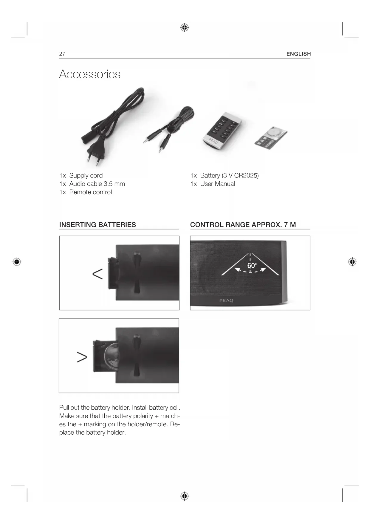 button 6 Remote control sensor 7 AUX IN jack 8 Supply cord socket 9 Component video out jacksCONTROL RANGE APPROX. 7 M 60° Pull out the battery holder. Install battery cell. Make sure that the battery polarity + match- es the + marking on the holder/remote. Re- place the battery holder. INSERTING BATTERIES ENGLISH