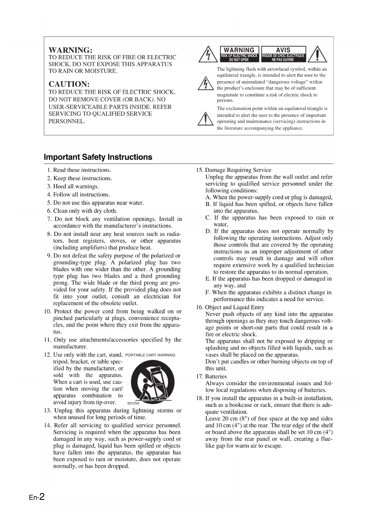 Remarques importantes pour votre sécurité 1. Veuillez lire ces instructions.2. Veuillez conserver ces instructions.3. Respectez tous les avertissements.4. Suivez toutes les instructions.5. Ne vous servez pas de cet appareil à proximité d’eau.6. Essuyez le boîtier avec un chiffon sec uniquement.7. Ne bloquez pas les orifices d’aération. Installez cet appareil en suivant les instructions du fabricant.8. Ne le placez pas à proximité de sources de chaleur telles que radiateurs, chauffage, poêles ou autre dispositif (y compris les amplificateurs) générateur de chaleur.9. N’essayez pas de circonvenir le dispositif de sécurité que représente une fiche polarisée ou une fiche avec mise à la terre. Une fiche polarisée dispose de deux lames dont l’une est plus large que l’autre. Une fiche avec terre est munie de deux lames ainsi que d’une broche de mise à la terre. La lame la plus large ou la broche assurent votre sécurité. Si la fiche fournie ne peut être insérée dans la prise murale, demandez à un électricien de remplacer la prise.10. Protégez le cordon d’alimentation en évitant qu’on ne marche pas dessus et qu’il ne soit plié (notamment au niveau des fiches, des cache-câbles et de la sortie de l’appareil).11. Servez-vous exclusivement des fixations/accessoires préconisés par le fabricant. 12. Utilisez exclusivement le chariot, le support, le trépied, la fixation ou la table spécifié(e) par le fabricant ou vendu(e) avec l’appareil. Un chariot contenant l’appareil doit toujours être déplacé avec précaution pour éviter qu’il ne se renverse et blesse quelqu’un.13. Débranchez l’appareil durant un orage ou lorsqu’il reste inutilisé longtemps.14. Veuillez faire appel à un technicien qualifié pour l’entretien. Un entretien est indispensable si l’appareil a été endommagé d’une façon ou d’une autre : cordon d’alimentation ou fiche endommagée, liquide renversé ou chute de petits objets dans l’appareil, exposition à la pluie ou à une humidité excessive, fonctionnement anormal ou chute de l’appareil.15. Dommages nécessitant réparationDébranchez l’appareil du secteur et confiez-le à un technicien qualifié lorsque :A. Le cordon d’alimentation ou sa fiche sont endommagés.B. Des objets sont tombés dans l’appareil ou du liquide a été renversé et a pénétré ce dernier.C. L’appareil a été exposé à la pluie.D. L’appareil ne semble pas fonctionner normalement lorsque vous l’utilisez en respectant les instructions données. N’effectuez que les réglages préconisés dans le manuel car un mauvais réglage d’autres commandes risque d’endommager l’appareil et nécessitera un long travail de remise en état par un technicien qualifié.E. L’appareil est tombé ou son boîtier est endommagé.F. Ses performances semblent affectées.16. Pénétration de corps étrangers et de liquideVeillez à ne pas insérer d’objets à l’intérieur de l’appareil car ils pourraient toucher des points de tension dangereux ou provoquer des court-circuits : il y a risque d’incendie ou d’électrocution. Veillez à ne jamais exposer l’appareil à des gouttes ou des jets d’eau. Ne déposez aucun objet contenant un liquide (un vase, par exemple) sur l’appareil.Ne déposez pas de bougies ou d’autres objets brûlants sur cette appareil. 17. PilesSongez à l’environnement et veillez dès lors à respecter les consignes officielles pour la liquidation de piles épuisées.18. Veillez à n’installer cet appareil que dans un rack ou un meuble qui n’entrave pas la ventilation. Laissez un espace libre de 20 cm au-dessus et à côté de l’appareil ainsi que 10 cm en face arrière. La face arrière du rack ou du meuble doit se trouver à 10 cm ou plus du mur pour assurer une aération adéquate en vue de dissiper la chaleur. ATTENTION: AFIN DE REDUIRE LES RISQUES D’INCENDIE ET DE DECHARGE ELECTRIQUE, NE PAS EXPOSER CET APPAREIL A LA PLUIE OU A L’HUMIDITE. DANGER: AFIN D’EVITER TOUT DANGER DE DECHARGE ELECTRIQUE, NE PAS OUVRIR LE BOITIER (OU L’ARRIERE) DE L’APPAREIL. CONFIER TOUT TRAVAIL D’ENTRETIEN OU DE REPARATION A UN TECHNICIEN QUALIFIE.Un symbole d’éclair fléché dans un triangle équilatéral est destiné à attirer l’attention de l’utilisateur sur le fait que certains organes internes non-isolés de l’appareil sont traversés par un courant électrique assez dangereux pour constituer un resque d’électrocution.Un point d’exclamation dans un triangle équilatéral est destiné à attirer l’attention de l’utilisateur sur des instructions importantes relatives à l’entretien et à l’utilisation du produit. WARNING RISK OF ELECTRIC SHOCK DO NOT OPEN RISQUE DE CHOC ELECTRIQUE NE PAS OUVRIR A VIS AVERTISSEMENT POUR SUPPORTS À ROULETTES S3125AFr-3