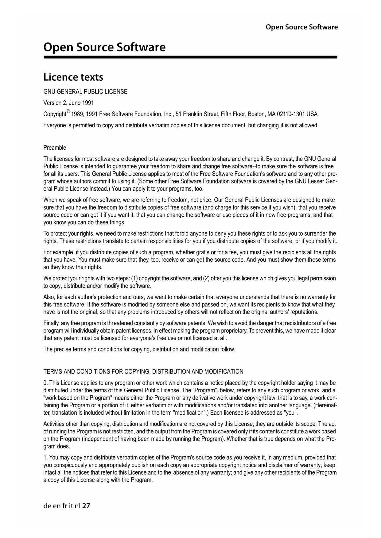 1991, 1999 Free Software Foundation, Inc. 51 Franklin Street, Fifth Floor, Boston, MA 02110-1301 USA Everyone is permitted to copy and distribute verbatim copies of this license document, but changing it is not allowed. [This is the first released version of the Lesser GPL. It also counts as the successor of the GNU Library Public License, version 2, hence the version number 2.1.] Preamble The licenses for most software are designed to take away your freedom to share and change it. By contrast, the GNU General Public Licenses are intended to guarantee your freedom to share and change free software--to make sure the software is free for all its users. This license, the Lesser General Public License, applies to some specially designated software packages--typically libraries- -of the Free Software Foundation and other authors who decide to use it. You can use it too, but we suggest you first think carefully about whether this license or the ordinary General Public License is the better strategy to use in any particular case, based on the explanations below. When we speak of free software, we are referring to freedom of use, not price. Our General Public Licenses are designed to make sure that you have the freedom to distribute copies of free software (and charge for this service if you wish); that you receive source code or can get it if you want it; that you can change the software and use pieces of it in new free programs; and that you are informed that you can do these things.de en fr it nl 31 Gigaset SL930H / QSG - IM1 fr / A31008-M2371-R101-1-4N43 / licence_en.fm / 8/12/13 Template Borneo, Version 1, 21.06.2012 Open Source Software To protect your rights, we need to make restrictions that forbid distributors to deny you these rights or to ask you to surrender these rights. These restrictions translate to certain responsibilities for you if you distribute copies of the library or if you modify it. For example, if you distribute copies of the library, whether gratis or for a fee, you must give the recipients all the rights that we gave you. You must make sure that they, too, receive or can get the source code. If you link other code with the library, you must provide complete object files to the recipients, so that they can relink them with the library after making changes to the library and recompiling it. And you must show them these terms so they know their rights. We protect your rights with a two-step method: (1) we copyright the library, and (2) we offer you this license, which gives you legal permission to copy, distribute and/or modify the library. To protect each distributor, we want to make it very clear that there is no warranty for the free library. Also, if the library is mod- ified by someone else and passed on, the recipients should know that what they have is not the original version, so that the original author's reputation will not be affected by problems that might be introduced by others. Finally, software patents pose a constant threat to the existence of any free program. We wish to make sure that a company cannot effectively restrict the users of a free program by obtaining a restrictive license from a patent holder. Therefore, we insist that any patent license obtained for a version of the library must be consistent with the full freedom of use specified in this license. Most GNU software, including some libraries, is covered by the ordinary GNU General Public License. This license, the GNU Lesser General Public License, applies to certain designated libraries, and is quite different from the ordinary General Public License. We use this license for certain libraries in order to permit linking those libraries into non-free programs. When a program is linked with a library, whether statically or using a shared library, the combination of the two is legally speak- ing a combined work, a derivative of the original library. The ordinary General Public License therefore permits such linking only if the entire combination fits its criteria of freedom. The Lesser General Public License permits more lax criteria for linking other code with the library. We call this license the "Lesser" General Public License because it does Less to protect the user's freedom than the ordinary General Public License. It also provides other free software developers Less of an advantage over competing non-free pro- grams. These disadvantages are the reason we use the ordinary General Public License for many libraries. However, the Lesser license provides advantages in certain special circumstances. For example, on rare occasions, there may be a special need to encourage the widest possible use of a certain library, so that it becomes a de-facto standard. To achieve this, non-free programs must be allowed to use the library. A more frequent case is that a free library does the same job as widely used non-free libraries. In this case, there is little to gain by limiting the free library to free software only, so we use the Lesser General Public License. In other cases, permission to use a particular library in non-free programs enables a greater number of people to use a large body of free software. For example, permission to use the GNU C Library in non-free programs enables many more people to use the whole GNU operating system, as well as its variant, the GNU/Linux operating system. Although the Lesser General Public License is Less protective of the users' freedom, it does ensure that the user of a program that is linked with the Library has the fre edom and the wherewithal to run that program using a modified version of the Library. The precise terms and conditions for copying, distribution and modification follow. Pay close attention to the difference between a "work based on the library" and a "work that uses the library". The former contains code derived from the library, whereas the latter must be combined with the library in order to run. TERMS AND CONDITIONS FOR COPYING, DISTRIBUTIO