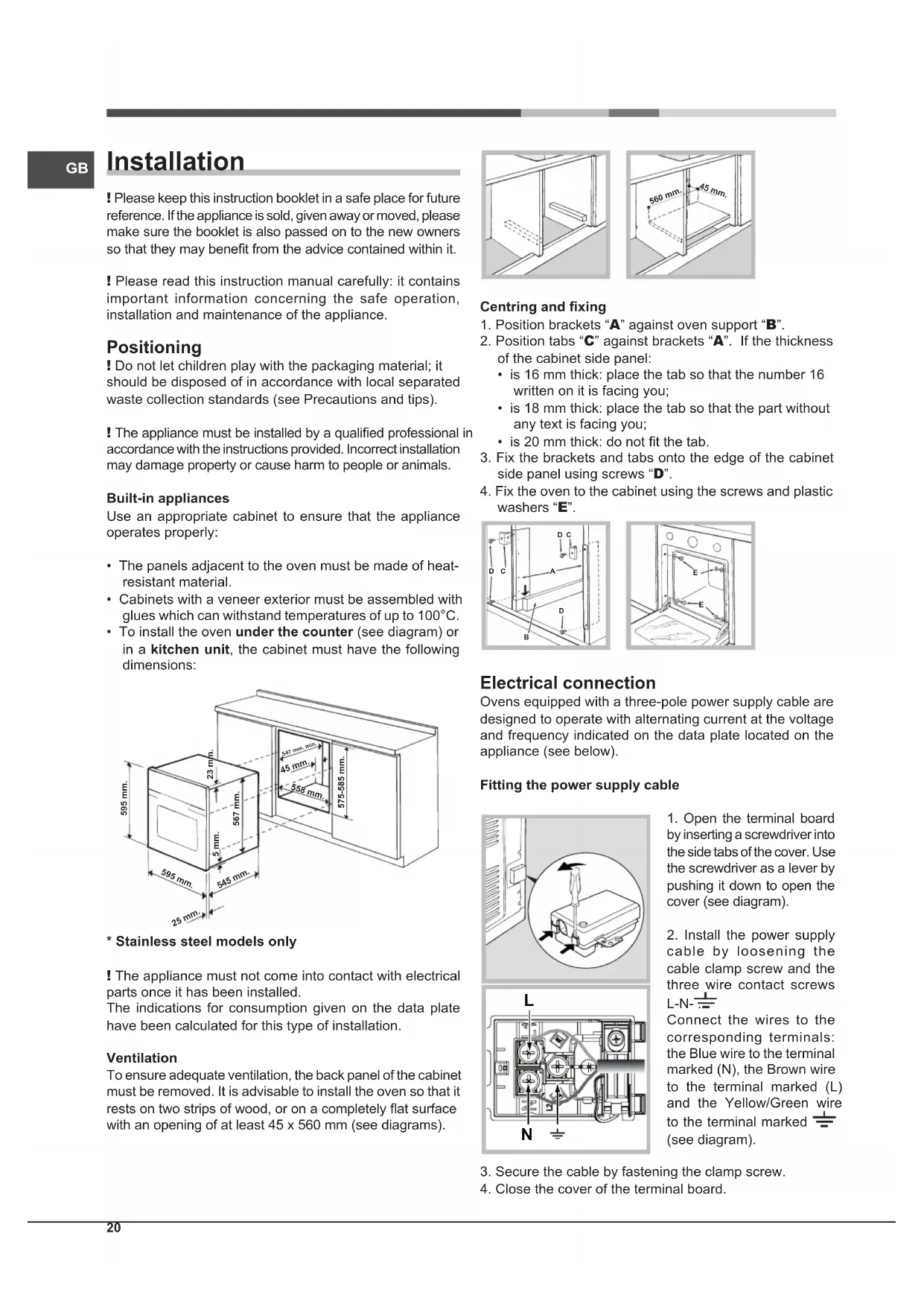 - Stainless steel models only ! The appliance must not come into contact with electrical parts once it has been installed. The indications for consumption given on the data plate have been calculated for this type of installation. Ventilation To ensure adequate ventilation, the back panel of the cabinet must be removed. It is advisable to install the oven so that it rests on two strips of wood, or on a completely at surface with an opening of at least 45 x 560 mm (see diagrams). 560 mm. 45 mm. Centring and xing