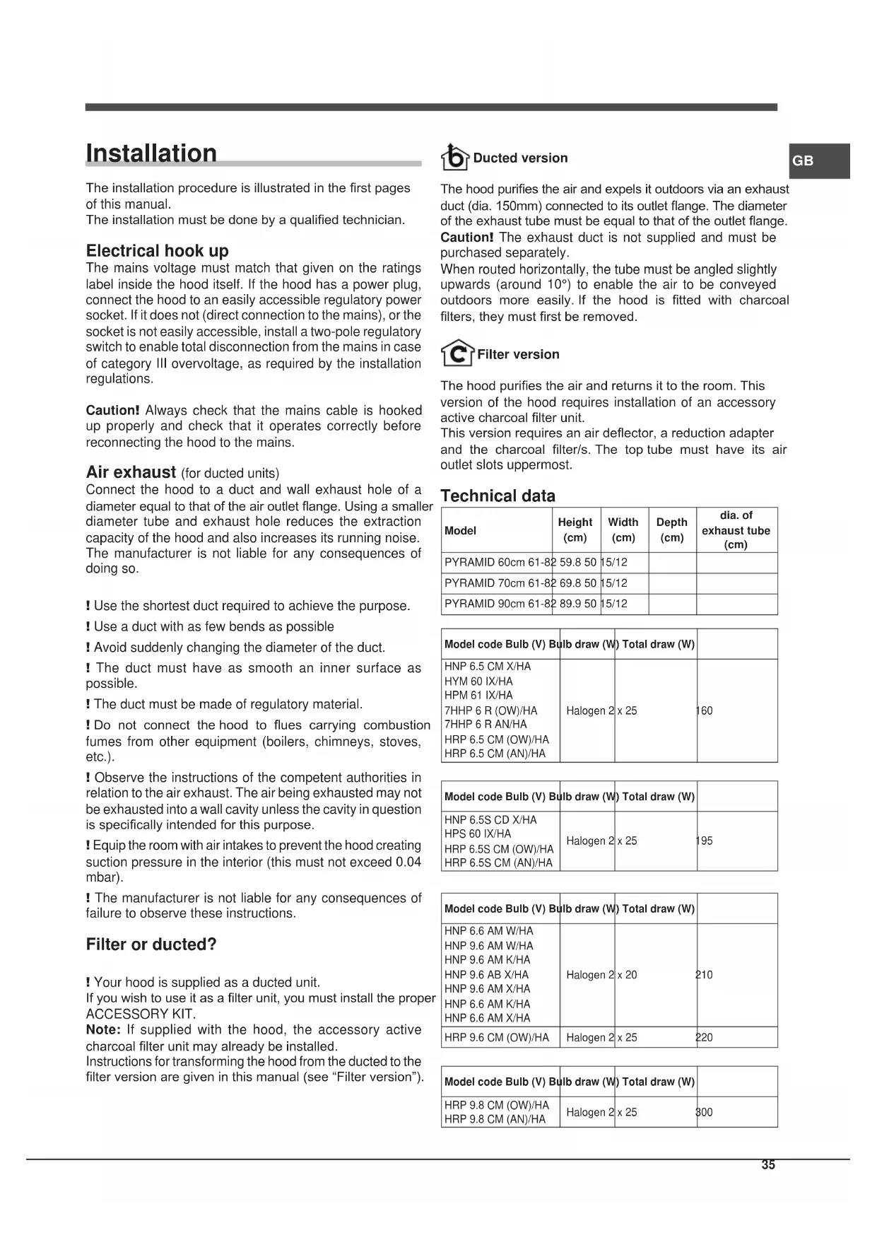 Installation The installation procedure is illustrated in the rst pages of this manual. The installation must be done by a qualied technician. Electrical hook up The mains voltage must match that given on the ratings label inside the hood itself. If the hood has a power plug, connect the hood to an easily accessible regulatory power socket. If it does not (direct connection to the mains), or the socket is not easily accessible, install a two-pole regulatory switch to enable total disconnection from the mains in case of category III overvoltage, as required by the installation regulations. Caution! Always check that the mains cable is hooked up properly and check that it operates correctly before reconnecting the hood to the mains. Air exhaust (for ducted units) Connect the hood to a duct and wall exhaust hole of a diameter equal to that of the air outlet ange. Using a smaller diameter tube and exhaust hole reduces the extraction capacity of the hood and also increases its running noise. The manufacturer is not liable for any consequences of doing so. ! Use the shortest duct required to achieve the purpose. ! Use a duct with as few bends as possible ! Avoid suddenly changing the diameter of the duct. ! The duct must have as smooth an inner surface as possible. ! The duct must be made of regulatory material. ! Do not connect the hood to ues carrying combustion fumes from other equipment (boilers, chimneys, stoves, etc.). ! Observe the instructions of the competent authorities in relation to the air exhaust. The air being exhausted may not be exhausted into a wall cavity unless the cavity in question is specically intended for this purpose. ! Equip the room with air intakes to prevent the hood creating suction pressure in the interior (this must not exceed 0.04 mbar). ! The manufacturer is not liable for any consequences of failure to observe these instructions. Filter or ducted? ! Your hood is supplied as a ducted unit. If you wish to use it as a lter unit, you must install the proper ACCESSORY KIT. Note: If supplied with the hood, the accessory active charcoal lter unit may already be installed. Instructions for transforming the hood from the ducted to the lter version are given in this manual (see “Filter version”). Ducted version The hood puries the air and expels it outdoors via an exhaust duct (dia. 150mm) connected to its outlet ange. The diameter of the exhaust tube must be equal to that of the outlet ange. Caution! The exhaust duct is not supplied and must be purchased separately. When routed horizontally, the tube must be angled slightly upwards (around 10°) to enable the air to be conveyed outdoors more easily. If the hood is tted with charcoal lters, they must rst be removed. Filter version The hood puries the air and returns it to the room. This version of the hood requires installation of an accessory active charcoal lter unit. This version requires an air deector, a reduction adapter and the charcoal lter/s. The top tube must have its air outlet slots uppermost. Technical data ModelHeight (cm) Width (cm) Depth (cm) dia. of exhaust tube (cm) PYRAMID 60cm 61-82 59.8 50 15/12PYRAMID 70cm 61-82 69.8 50 15/12PYRAMID 90cm 61-82 89.9 50 15/12Model code Bulb (V) Bulb draw (W) Total draw (W)HNP 6.5 CM X/HAHYM 60 IX/HAHPM 61 IX/HA7HHP 6 R (OW)/HA7HHP 6 R AN/HAHRP 6.5 CM (OW)/HAHRP 6.5 CM (AN)/HAHalogen 2 x 25 160Model code Bulb (V) Bulb draw (W) Total draw (W)HNP 6.5S CD X/HAHPS 60 IX/HAHRP 6.5S CM (OW)/HAHRP 6.5S CM (AN)/HAHalogen 2 x 25 195Model code Bulb (V) Bulb draw (W) Total draw (W)HNP 6.6 AM W/HAHNP 9.6 AM W/HAHNP 9.6 AM K/HAHNP 9.6 AB X/HAHNP 9.6 AM X/HAHNP 6.6 AM K/HAHNP 6.6 AM X/HAHalogen 2 x 20 210HRP 9.6 CM (OW)/HA Halogen 2 x 25 220Model code Bulb (V) Bulb draw (W) Total draw (W)HRP 9.8 CM (OW)/HAHRP 9.8 CM (AN)/HAHalogen 2 x 25 30036