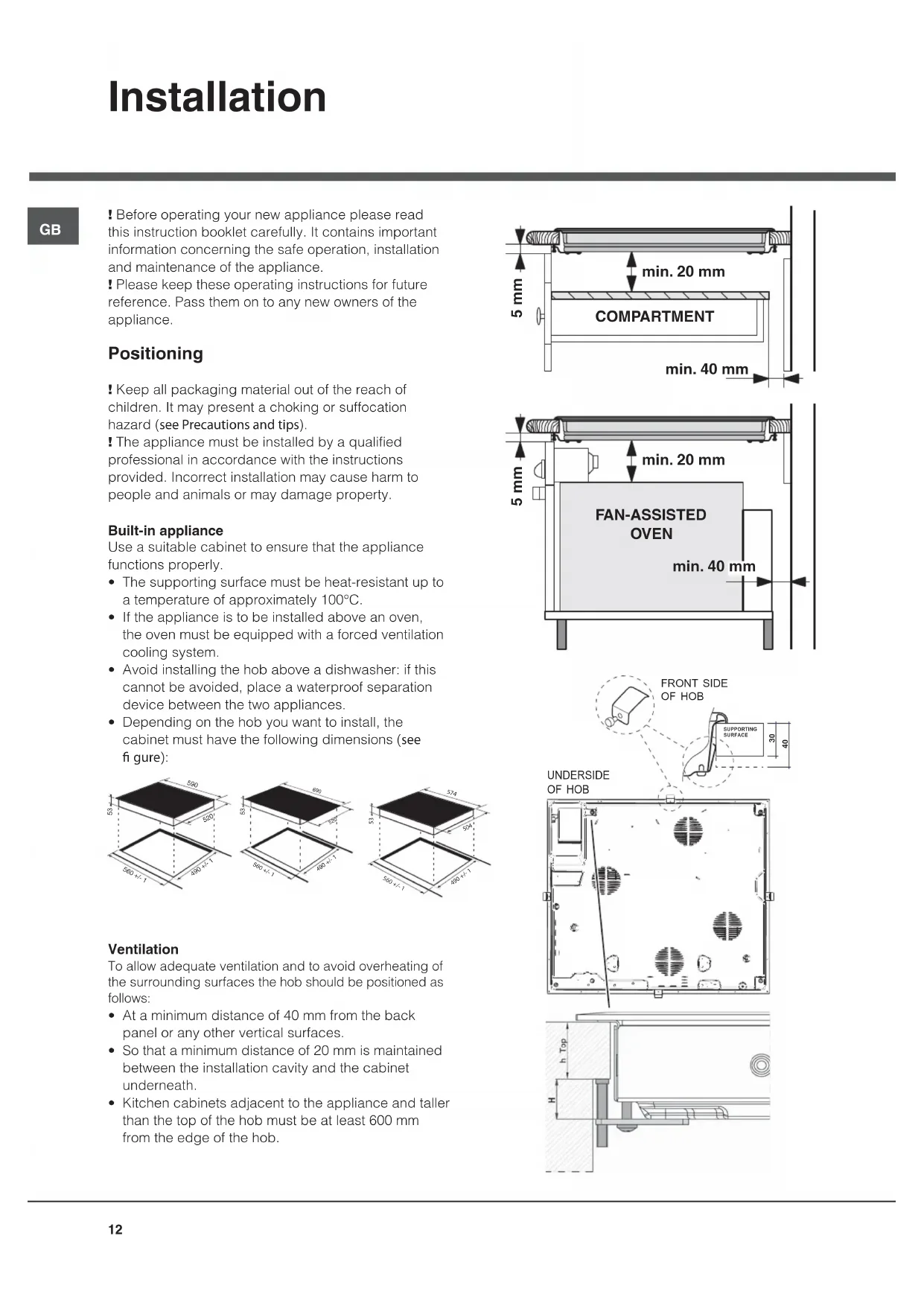 - Depending on the hob you want to install, the cabinet must have the following dimensions (see gure): Ventilation To allow adequate ventilation and to avoid overheating of the surrounding surfaces the hob should be positioned as follows: