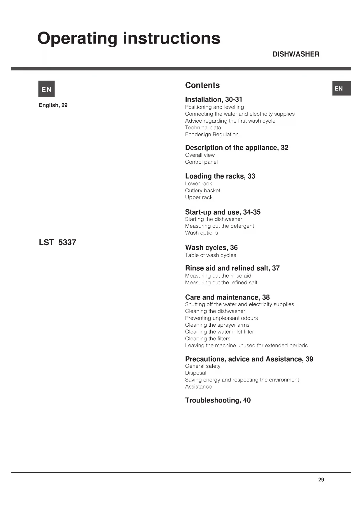Operating instructions Contents Installation, 30-31 Positioning and levelling Connecting the water and electricity supplies Advice regarding the first wash cycle Technical data Ecodesign Regulation Description of the appliance, 32 Overall view Control panel Loading the racks, 33 Lower rack Cutlery basket Upper rack Start-up and use, 34-35 Starting the dishwasher Measuring out the detergent Wash options Wash cycles, 36 Table of wash cycles Rinse aid and refined salt, 37 Measuring out the rinse aid Measuring out the refined salt Care and maintenance, 38 Shutting off the water and electricity supplies Cleaning the dishwasher Preventing unpleasant odours Cleaning the sprayer arms Cleaning the water inlet filter Cleaning the filters Leaving the machine unused for extended periods Precautions, advice and Assistance, 39 General safety Disposal Saving energy and respecting the environment Assistance Troubleshooting, 40 English, 29