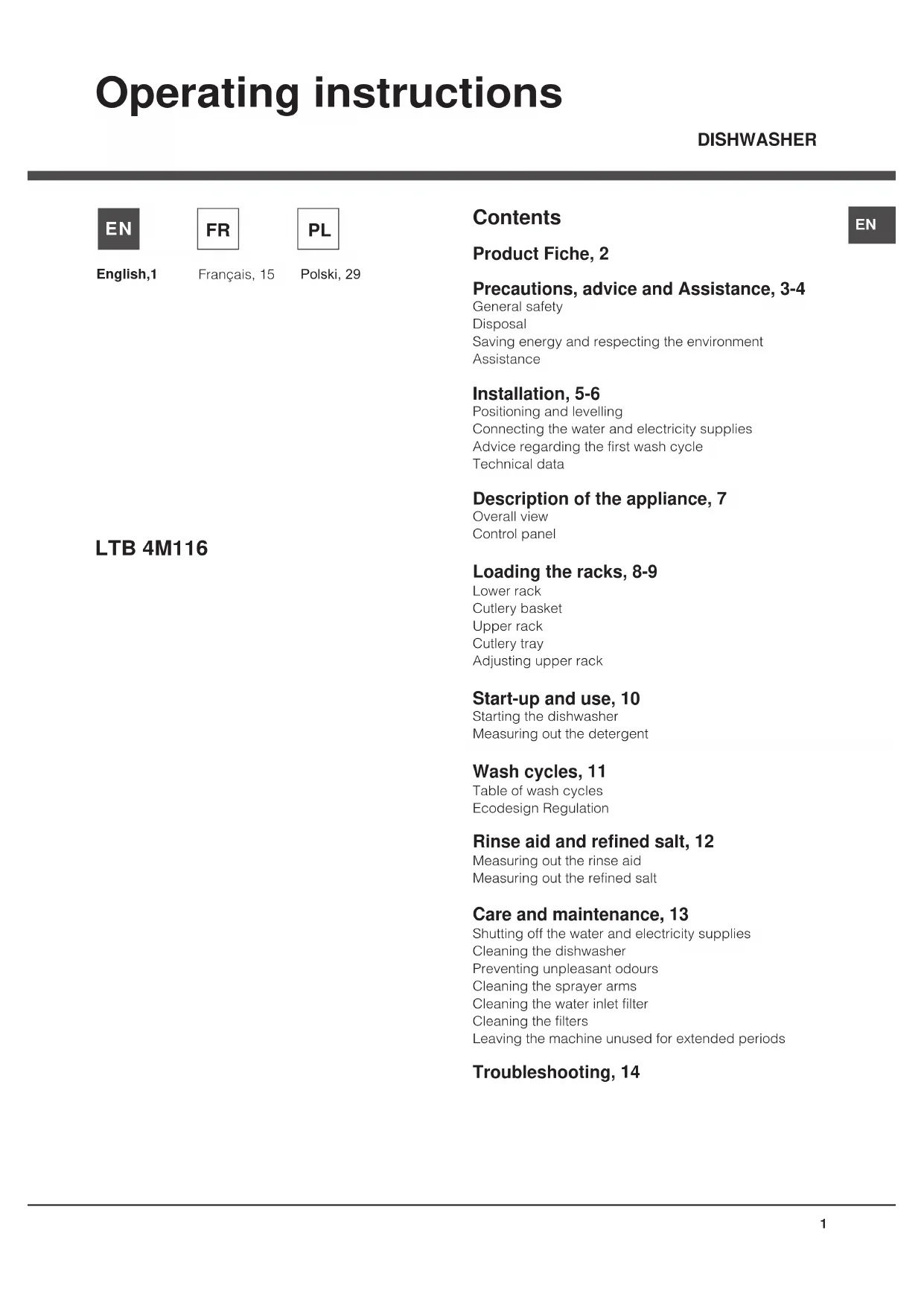 Operating instructions Contents Product Fiche, 2 Precautions, advice and Assistance, 3-4 General safety Disposal Saving energy and respecting the environment Assistance Installation, 5-6 Positioning and levelling Connecting the water and electricity supplies Advice regarding the first wash cycle Technical data Description of the appliance, 7 Overall view Control panel Loading the racks, 8-9 Lower rack Cutlery basket Upper rack Cutlery tray Adjusting upper rack Start-up and use, 10 Starting the dishwasher Measuring out the detergent Wash cycles, 11 Table of wash cycles Ecodesign Regulation Rinse aid and refined salt, 12 Measuring out the rinse aid Measuring out the refined salt Care and maintenance, 13 Shutting off the water and electricity supplies Cleaning the dishwasher Preventing unpleasant odours Cleaning the sprayer arms Cleaning the water inlet filter Cleaning the filters Leaving the machine unused for extended periods Troubleshooting, 14 English,1