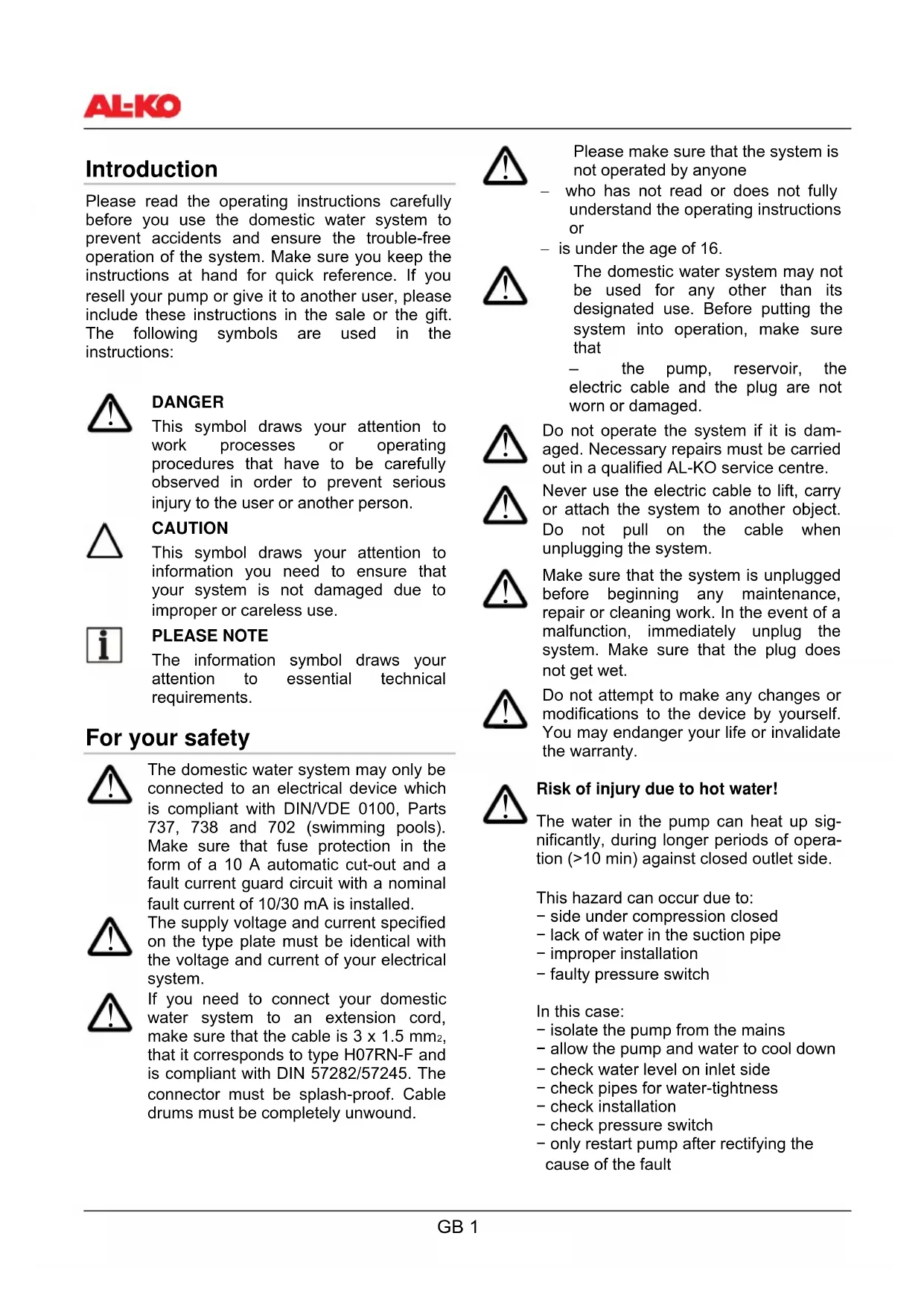 Risk of injury due to hot water! The water in the pump can heat up sig- nificantly, during longer periods of opera- tion (>10 min) against closed outlet side. This hazard can occur due to: − side under compression closed − lack of water in the suction pipe − improper installation − faulty pressure switch In this case: − isolate the pump from the mains − allow the pump and water to cool down − check water level on inlet side − check pipes for water-tightness − check installation − check pressure switch − only restart pump after rectifying the cause of the fault GB 1Use GB 2 Designated use The domestic water system is designed for home use in your house or garden. Please observe the technical data given in the instructions before putting the system into operation. Your domestic water system has been designed for use in the following applications: − irrigation and watering, e.g. of your lawn or flower and vegetable gardens − domestic water supply − increasing pressure in the domestic water supply. Please observe the regulations issued by your local water works. If necessary, ask a plumber. The system is designed to pump only the following liquids: − clear water − rain water Prohibited use Your domestic water system is not intended for permanent operation. The system may not be used to pump the following liquids: − saltwater − beverages or liquid foods − corrosives or chemicals − acids or combustible, explosive or gas- forming liquids − liquids with a temperature above 35 °C − sandy water or water containing abrasives Description of the system Domestic water system/accessories (Figs. A, B) 1 Pump inlet/suction hose connector 2 Filler screw 3 Pump outlet/pressure hose connector 4 Motor housing 5 Valve 6 Reservoir 7 Pressure gauge 8 Electric cable 9 Draining screw 10 Pressure switch 11 Compensating hose 12 Pump chamber 13 Filter (accessories) 14 AL-KO suction kit (accessories)
