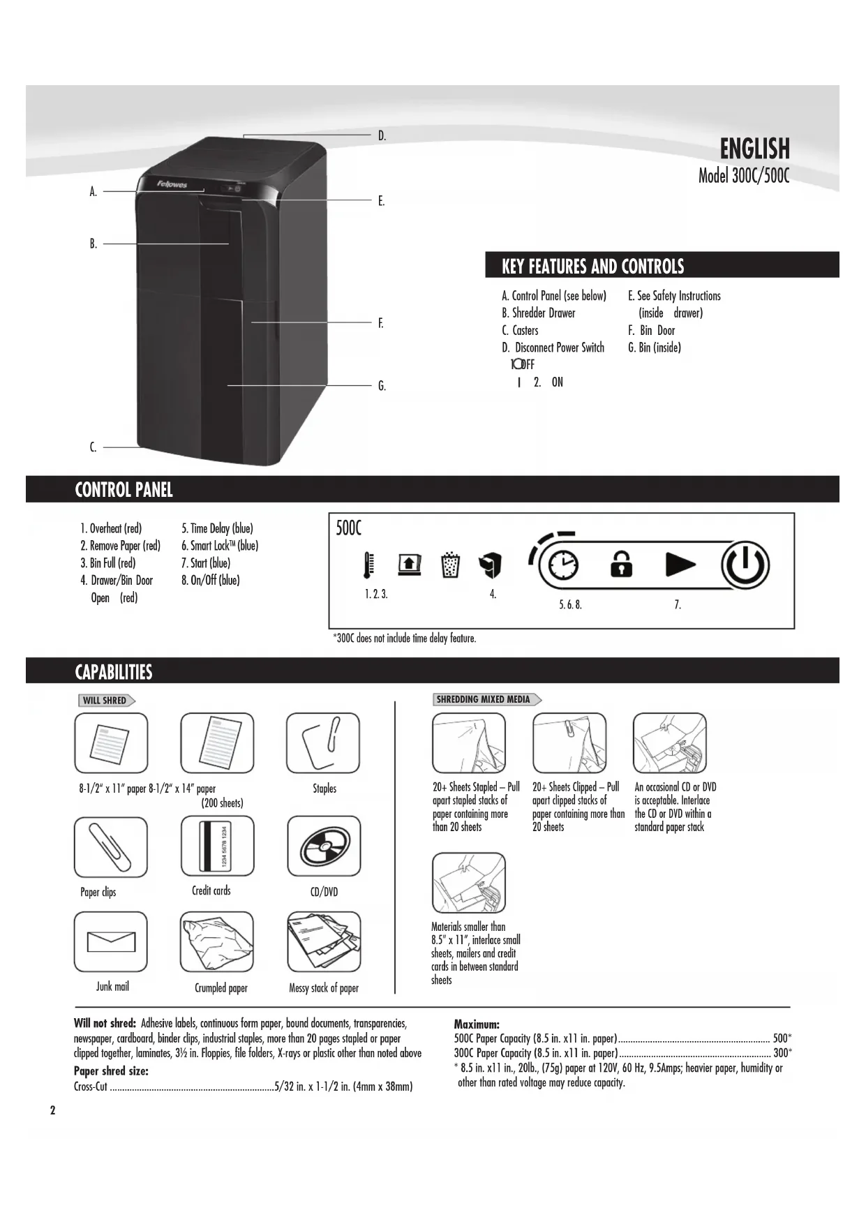 KEY FEATURES AND CONTROLS CAPABILITIES CONTROL PANEL ENGLISH Model 300C/500C Will not shred: Adhesive labels, continuous form paper, bound documents, transparencies,