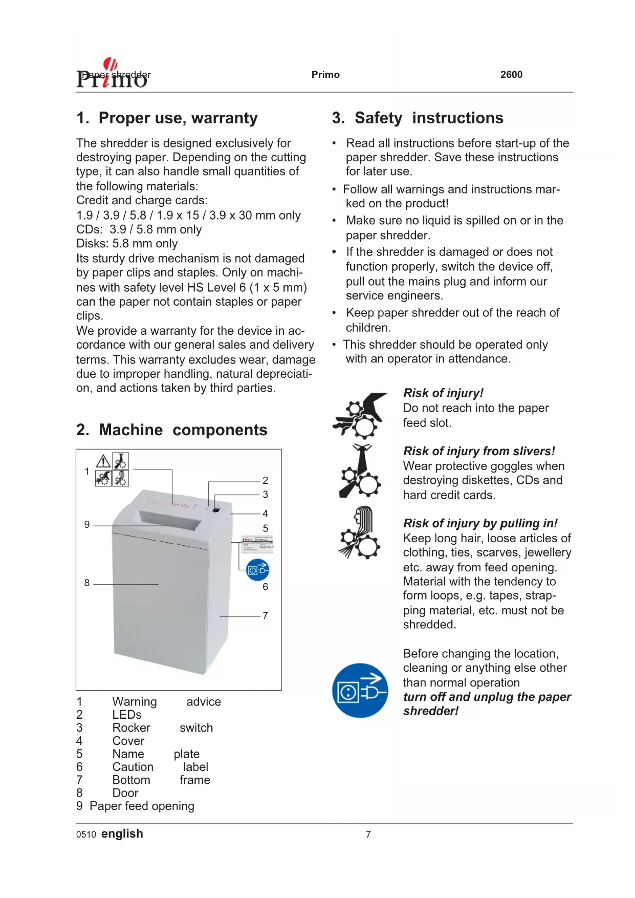 CDs: 3.9 / 5.8 mm only Disks: 5.8 mm only Its sturdy drive mechanism is not damaged by paper clips and staples. Only on machi- nes with safety level HS Level 6 (1 x 5 mm) can the paper not contain staples or paper clips. We provide a warranty for the device in ac- cordance with our general sales and delivery terms. This warranty excludes wear, damage due to improper handling, natural depreciati- on, and actions taken by third parties.Primo 2600 Paper shredder 8 english 0510