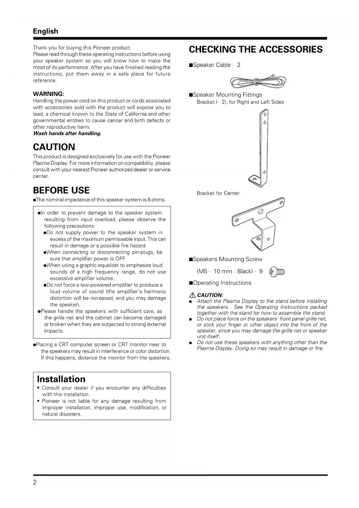CAUTION This product is designed exclusively for use with the PioneerPlasma Display. For more information on compatibility, pleaseconsult with your nearest Pioneer authorized dealer or servicecenter. BEFORE USE ÷ The nominal impedance of this speaker system is 8 ohms.÷ In order to prevent damage to the speaker systemresulting from input overload, please observe thefollowing precautions:÷ Do not supply power to the speaker system inexcess of the maximum permissable input. This canresult in damage or a possible fire hazard.÷ When connecting or disconnecting pin-plugs, besure that amplifier power is OFF.÷ When using a graphic equalizer to emphasize loudsounds of a high frequency range, do not useexcessive amplifier volume.÷ Do not force a low-powered amplifier to produce aloud volume of sound (the amplifier’s harmonicdistortion will be increased, and you may damagethe speaker).÷ Please handle the speakers with sufficient care, asthe grille net and the cabinet can become damagedor broken when they are subjected to strong externalimpacts.÷ Placing a CRT computer screen or CRT monitor near tothe speakers may result in interference or color distortion.If this happens, distance the monitor from the speakers. Installation • Consult your dealer if you encounter any difficultieswith this installation.• Pioneer is not liable for any damage resulting fromimproper installation, improper use, modification, ornatural disasters. CHECKING THE ACCESSORIES