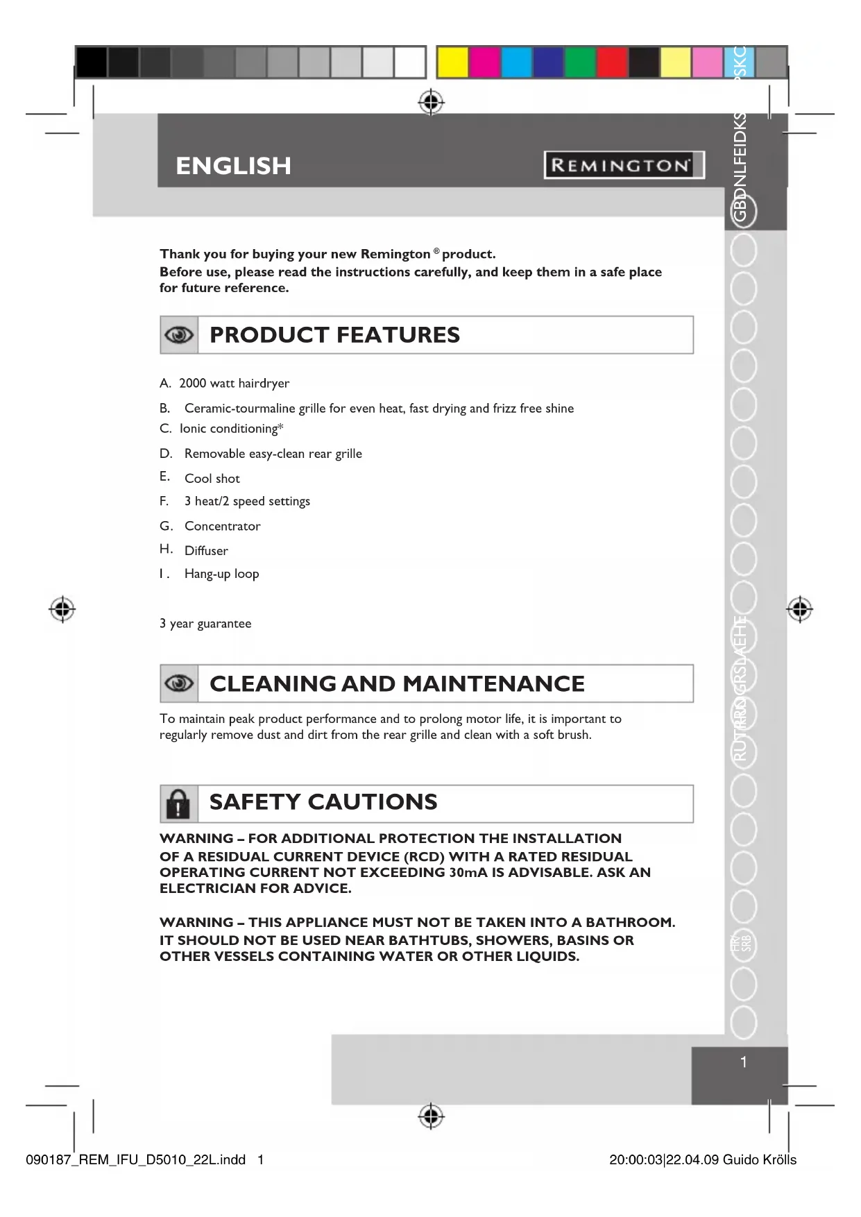 CLEANING AND MAINTENANCE To maintain peak product performance and to prolong motor life, it is important to regularly remove dust and dirt from the rear grille and clean with a soft brush. SAFETY CAUTIONS WARNING – FOR ADDITIONAL PROTECTION THE INSTALLATION OF A RESIDUAL CURRENT DEVICE (RCD) WITH A RATED RESIDUAL OPERATING CURRENT NOT EXCEEDING 30mA IS ADVISABLE. ASK AN ELECTRICIAN FOR ADVICE.WARNING – THIS APPLIANCE MUST NOT BE TAKEN INTO A BATHROOM. IT SHOULD NOT BE USED NEAR BATHTUBS, SHOWERS, BASINS OR OTHER VESSELS CONTAINING WATER OR OTHER LIQUIDS.090187_REM_IFU_D5010_22L.indd 1 20:00:03|22.04.09 Guido Krölls B. Ceramic-tourmaline grille for even heat, fast drying and frizz free shineC. Ionic conditioning* I .ENGLISH