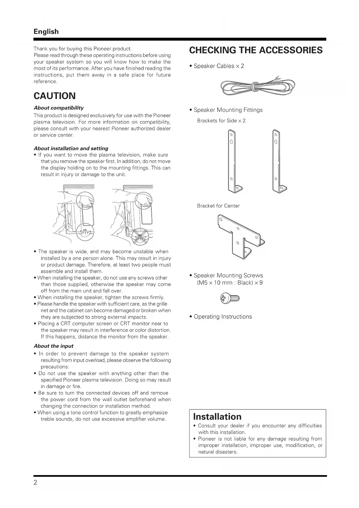 CAUTION About compatibility This product is designed exclusively for use with the Pioneerplasma television. For more information on compatibility,please consult with your nearest Pioneer authorized dealeror service center. About installation and setting • If you want to move the plasma television, make surethat you remove the speaker first. In addition, do not movethe display holding on to the mounting fittings. This canresult in injury or damage to the unit. CHECKING THE ACCESSORIES