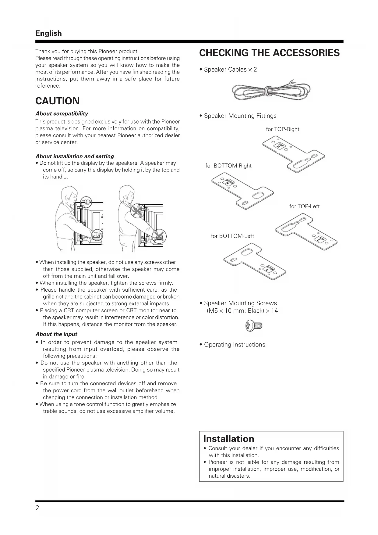 CAUTION About compatibility This product is designed exclusively for use with the Pioneerplasma television. For more information on compatibility,please consult with your nearest Pioneer authorized dealeror service center. About installation and setting • Do not lift up the display by the speakers. A speaker maycome off, so carry the display by holding it by the top andits handle. Installation • Consult your dealer if you encounter any difficultieswith this installation.• Pioneer is not liable for any damage resulting fromimproper installation, improper use, modification, ornatural disasters. CHECKING THE ACCESSORIES