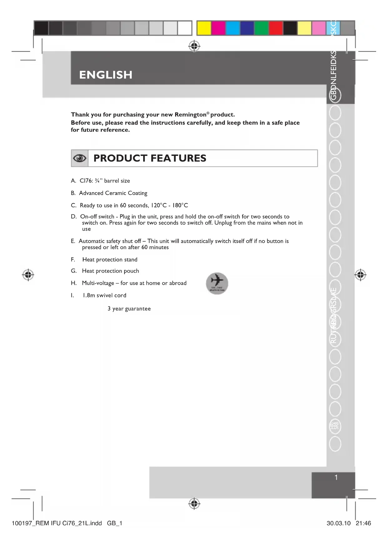 SRB Thank you for purchasing your new Remington ® product. Before use, please read the instructions carefully, and keep them in a safe place for future reference. PRODUCT FEATURES A. CI76: ¾” barrel sizeB. Advanced Ceramic Coating C. Ready to use in 60 seconds, 120°C - 180°CD. On-off switch - Plug in the unit, press and hold the on-off switch for two seconds to switch on. Press again for two seconds to switch off. Unplug from the mains when not in use E. Automatic safety shut off – This unit will automatically switch itself off if no button is pressed or left on after 60 minutesF. Heat protection standG. Heat protection pouchH. Multi-voltage – for use at home or abroad I. 1.8m swivel cord 3 year guarantee 1