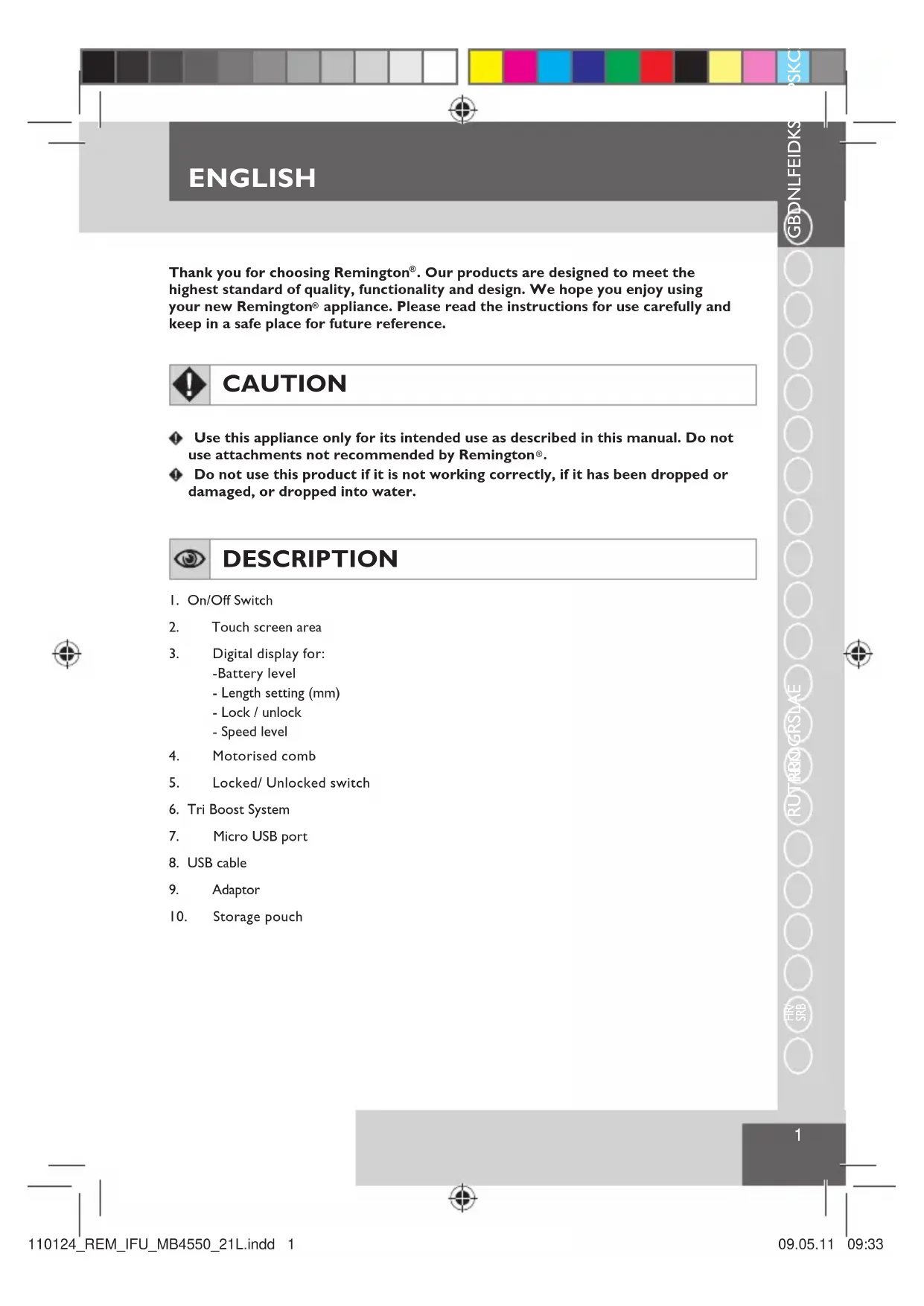 Do not use this product if it is not working correctly, if it has been dropped or damaged, or dropped into water. DESCRIPTION 1. On/Off Switch2. Touch screen area3. Digital display for:-Battery level- Length setting (mm)- Lock / unlock- Speed level4. Motorised comb5. Locked/ Unlocked switch6. Tri Boost System7. Micro USB port8. USB cable9. Adaptor10. Storage pouch110124_REM_IFU_MB4550_21L.indd 1 09.05.11 09:33ENGLISH