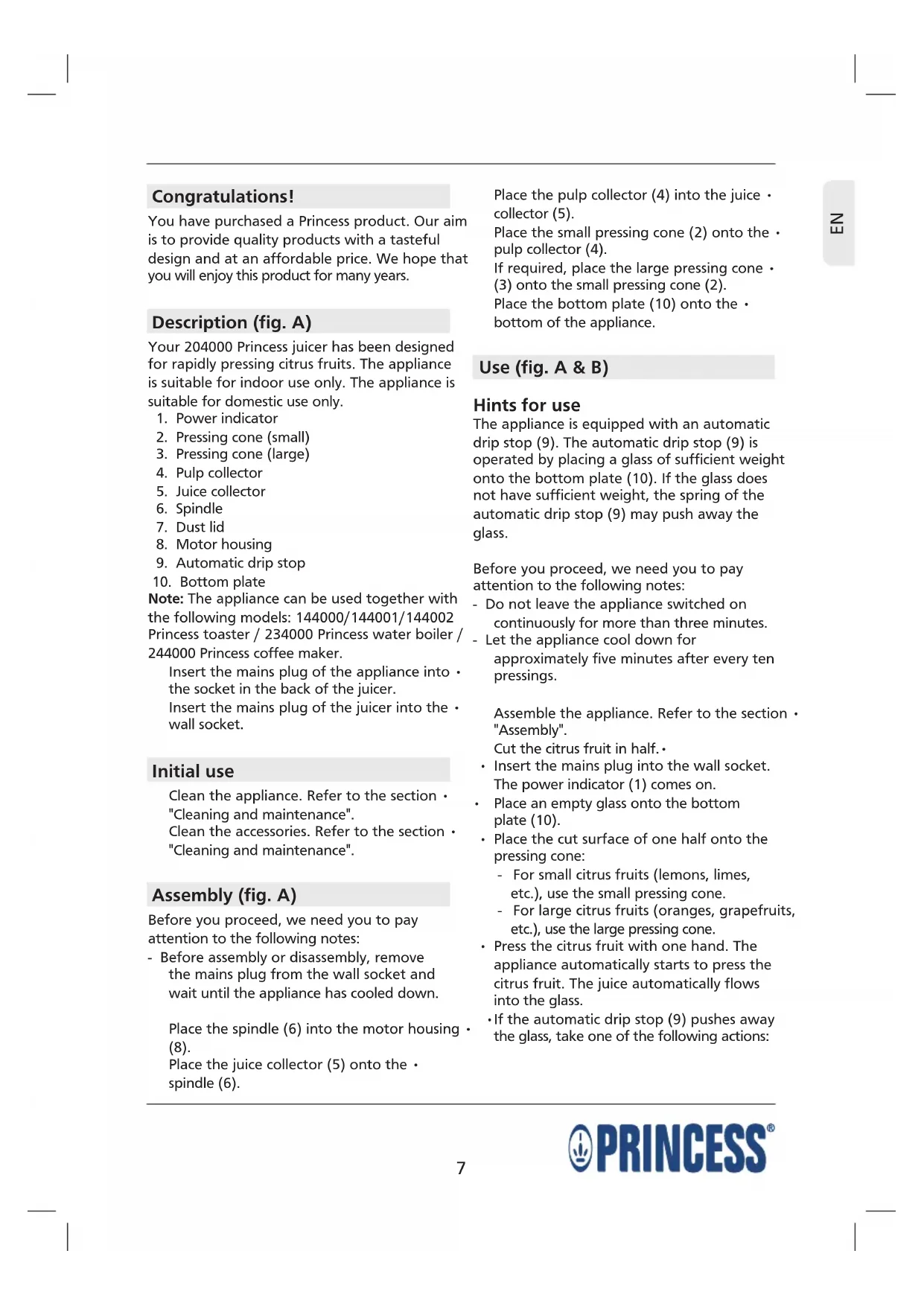 Note: The appliance can be used together with the following models: 144000/144001/144002 Princess toaster / 234000 Princess water boiler / 244000 Princess coffee maker. Insert the mains plug of the appliance into • the socket in the back of the juicer. Insert the mains plug of the juicer into the • wall socket. Initial use Clean the appliance. Refer to the section • "Cleaning and maintenance". Clean the accessories. Refer to the section • "Cleaning and maintenance". Assembly (fig. A) Before you proceed, we need you to pay attention to the following notes: - Before assembly or disassembly, remove the mains plug from the wall socket and wait until the appliance has cooled down. Place the spindle (6) into the motor housing • (8). Place the juice collector (5) onto the • spindle (6). Place the pulp collector (4) into the juice • collector (5). Place the small pressing cone (2) onto the • pulp collector (4). If required, place the large pressing cone • (3) onto the small pressing cone (2). Place the bottom plate (10) onto the • bottom of the appliance. Use (fig. A & B) Hints for use The appliance is equipped with an automatic drip stop (9). The automatic drip stop (9) is operated by placing a glass of sufficient weight onto the bottom plate (10). If the glass does not have sufficient weight, the spring of the automatic drip stop (9) may push away the glass. Before you proceed, we need you to pay attention to the following notes: - Do not leave the appliance switched on continuously for more than three minutes. - Let the appliance cool down for approximately five minutes after every ten pressings. Assemble the appliance. Refer to the section • "Assembly". Cut the citrus fruit in half.• Insert the mains plug into the wall socket. • The power indicator (1) comes on. Place an empty glass onto the bottom • plate (10). Place the cut surface of one half onto the • pressing cone: - For small citrus fruits (lemons, limes, etc.), use the small pressing cone. - For large citrus fruits (oranges, grapefruits, etc.), use the large pressing cone. Press the citrus fruit with one hand. The • appliance automatically starts to press the citrus fruit. The juice automatically flows into the glass. If the automatic drip stop (9) pushes away • the glass, take one of the following actions:8