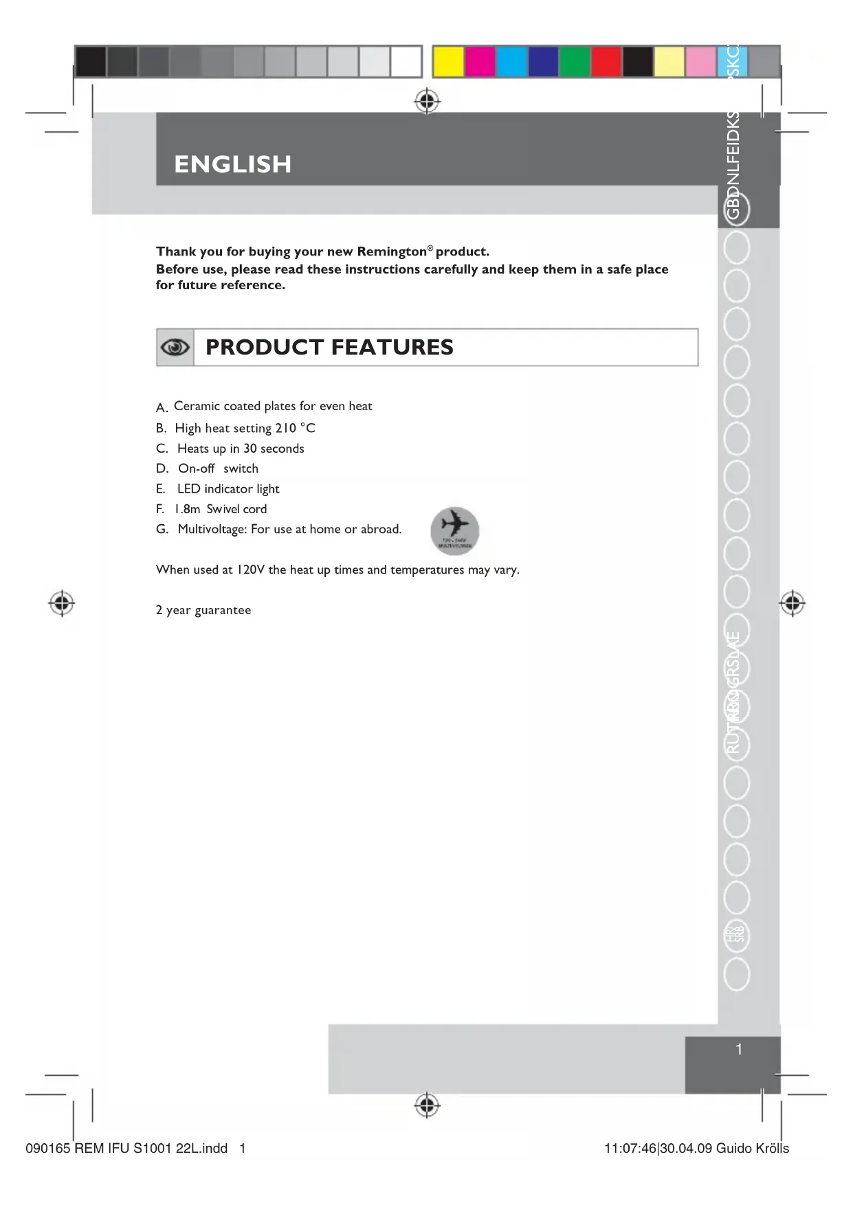 PRODUCT FEATURES A. B. High heat setting 210 °CC. Heats up in 30 secondsD. On-off switchE. LED indicator lightF. Swivel cordG. Multivoltage: For use at home or abroad.When used at 120V the heat up times and temperatures may vary.2 year guarantee 1