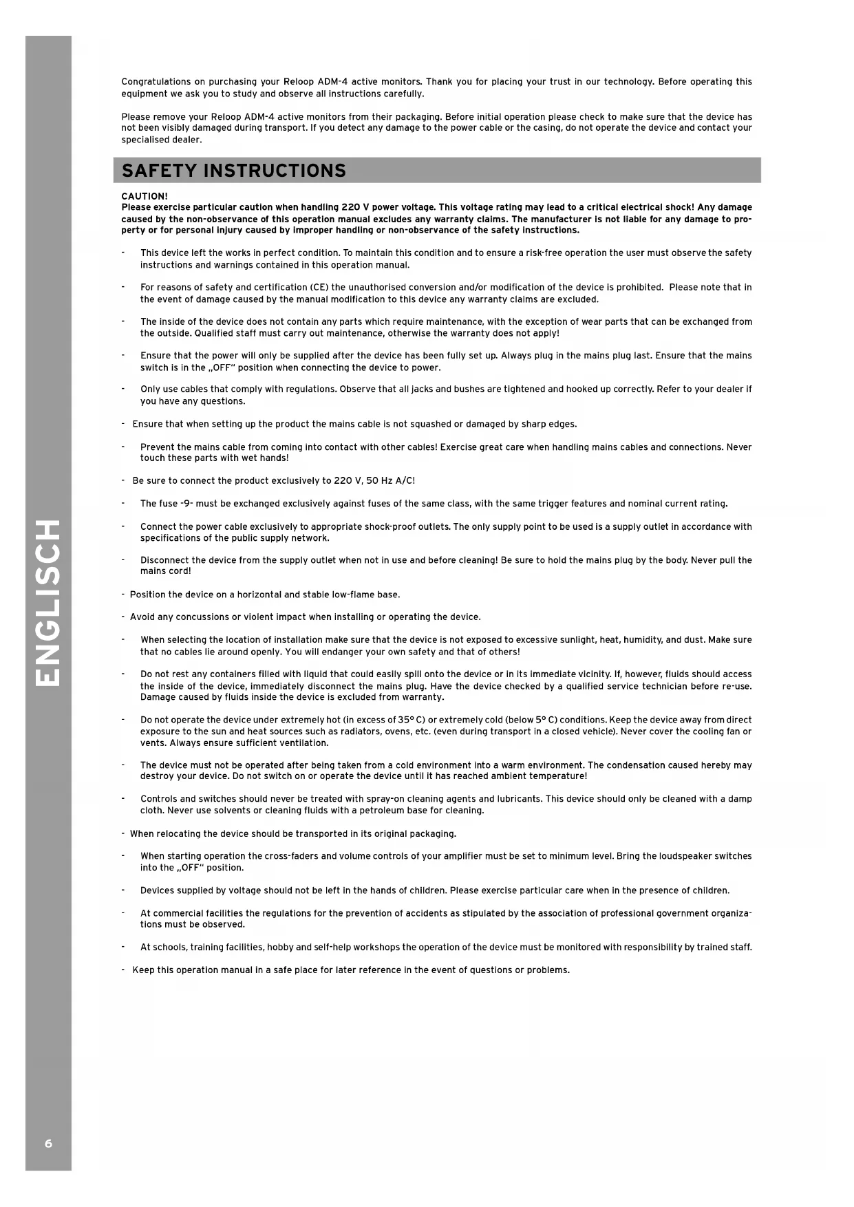 Congratulations on purchasing your Reloop ADM-4 active monitors. Thank you for placing your trust in our technology. Before operating this equipment we ask you to study and observe all instructions carefully.