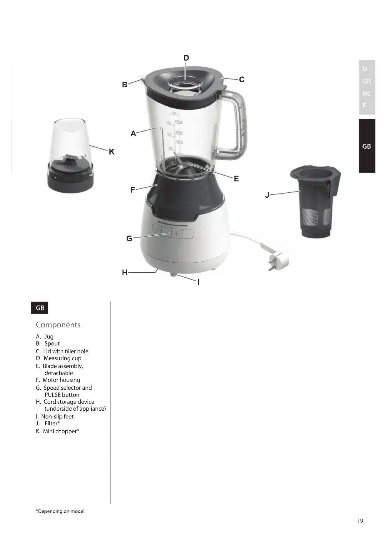 A. Jug B. Spout C. Lid with ller hole D. Measuring cup E. Blade assembly, detachable F. Motor housing G. Speed selector and PULSE button H. Cord storage device (underside of appliance)